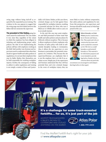 more likely to insist, without compromise, that safety policies and regulations be met. From this perspective, site supervisors and foreman should be made aware of what hapLT pened in this case. Robert Kennaley and Josh Winter practice construction law in Toronto and Simcoe, Ont. They speak and write on construction law issues and can be reached for comment at 416-700-4142 or at rjk@ kennaley.ca and jwinter@ kennaley.ca. This material is for information purposes and is not intended to provide legal advice. Readers who have concerns about any particular circumstance are encouraged to seek independent legal advice in that regard.