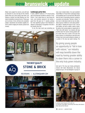 Landscape party time In April, LNB/PEI hosted its 15th annual spring gala and landscape excellence awards in Fredericton. I had a good view as I was facing the room, and everyone seemed to be having a good time. We gave out 11 awards, perhaps the most significant going to Tom Murdock of Allgreen Landscaping in recognition of his life in the industry (thus far). To me, the main event was something we