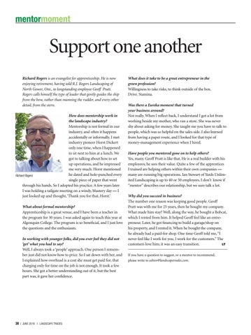 Support one another Richard Rogers is an evangelist for apprenticeship. He is now enjoying retirement, having sold R.J. Rogers Landscaping of North Gower, Ont., to longstanding employee Geoff Pratt. Rogers calls himself the type of leader that gently guides the ship from the bow, rather than manning the rudder, and every other detail, from the stern. How does mentorship work in the landscape industry? Mentorship is not formal in our industry, and often it happens accidentally or informally. I met industry pioneer Horst Dickert only one time, when I happened to sit next to him at a lunch. We got to talking about how to set up operations, and he impressed me very much. Horst mentioned he dated and hole-punched every Richard Rogers single piece of paper that went through his hands. So I adopted his practice. A few years later I was holding a tailgate meeting on a windy, blustery day — I just looked up and thought, ‘Thank you for that, Horst.’ What about formal mentorship? Apprenticeship is a great venue, and I have been a teacher in the program for 30 years. I was asked again to teach this year at Algonquin College. The program is so beneficial, and I just love the questions and the enthusiasm. In working with younger folks, did you ever feel they did not ‘get’ what you had to say? Well, I always took a ‘people’ approach. One person I remember just did not know how to price. So I sat down with her, and I explained how overhead is a cost she must get paid for; that charging only for time on the job is not enough. It took a few hours. She got a better understanding out of it, but the best part was, it gave her confidence.