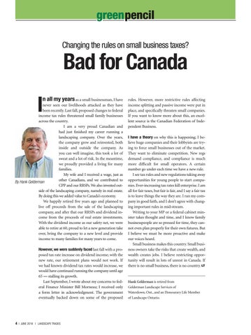 n all my years as a small businessman, I have never seen our livelihoods attacked as they have been recently. Last fall, proposed changes to federal income tax rules threatened small family businesses across the country. I am a very proud Canadian and had just finished my career running a landscaping company. Over the years, the company grew and reinvested, both inside and outside the company. As you can well imagine, this took a lot of sweat and a lot of risk. In the meantime, we proudly provided a living for many families. My wife and I received a wage, just as other Canadians, and we contributed to By Hank Gelderman CPP and our RRSPs. We also invested outside of the landscaping company, namely in real estate. By doing this we added value to Canada’s economy. We happily retired five years ago and planned to live off proceeds from the sale of the landscaping company, and after that our RRSPs and dividend income from the proceeds of real estate investments. With the dividend income as our safety net, we were able to retire at 60, proud to let a new generation take over, bring the company to a new level and provide income to many families for many years to come. However, we were suddenly faced last fall with a proposed tax rate increase on dividend income; with the new rate, our retirement plans would not work. If we had known dividend tax rates would increase, we would have continued running the company until age 65 — stalling its growth. Last September, I wrote about my concerns to federal Finance Minister Bill Morneau; I received only a form letter in acknowledgment. The government eventually backed down on some of the proposed