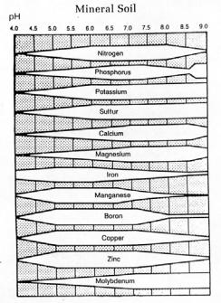 The natural soil that exists in your landscape and/ or farm is the most important aspect to understand. There are practices you can implement to amend your soil to help correct a few traits slightly, but these practices are only short-term solutions and once the soil is in place with plant material growing in it, it becomes extremely difficult to continue to amend it. Usually, the biggest thing we are striving to change in the soil when we amend it is the natural pH level in the soil. pH in the soil is extremely important to understand since the element your plant requires to thrive may be present in the soil in relatively large amounts, but the pH of the soil ties up the element and does not allow the plant to access it. The graphs below depict the different ranges of pH found in soils versus what elements are available at the different pH levels. The wider the band is for that element, the more readily available it is for the plants. All elements contribute to the success of a plant, however, the focus on this article is on iron and the importance of it.