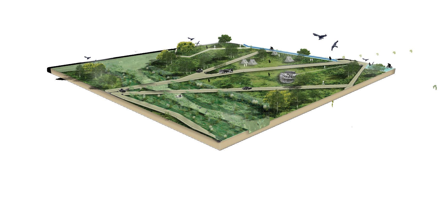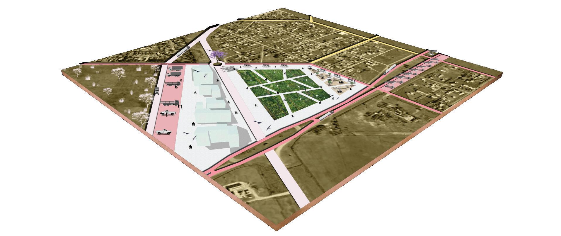 Desde el mismo eje, se desprenden los nodos de acceso a la ciudad, uno desde la pieza productiva, vinculada a la fase rural y otro al área urbana que permite un ingreso directo a la trama de la ciudad. Por último se determina una pieza ambiental destinada a la regeneración y conservación del patrimonio natural.