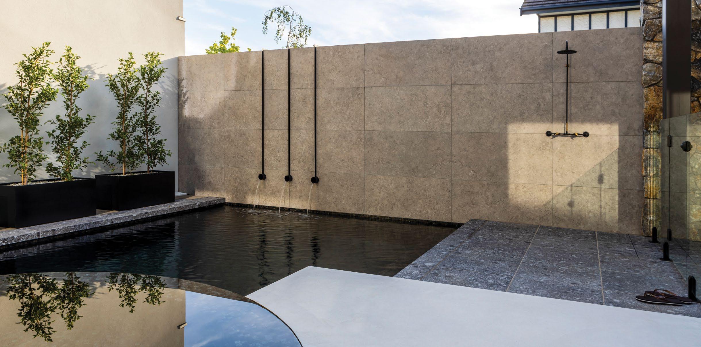 Tile selection integrates the pool and paving, blurring the lines between the two and melding the areas together. An almost flawless interior finish with internal fit off of lights and skimmer box barely definable is a highlight.