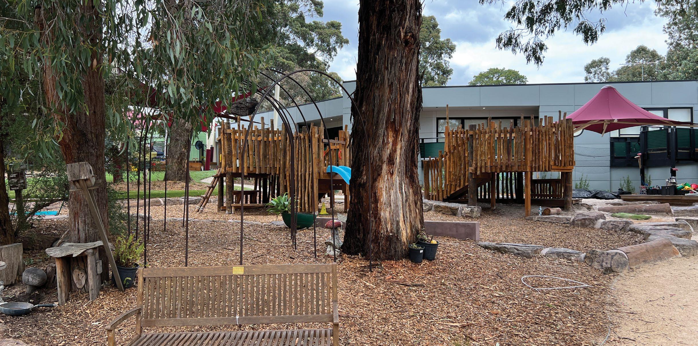 This playground uses natural materials cleverly mixed with the more constructed forms of playground equipment. The overall appearance is one of a clearing in a bush setting offering natural stimulation that is hard to find in other playgrounds.
