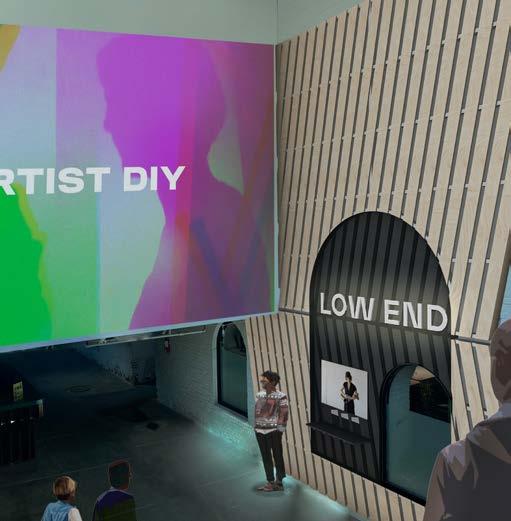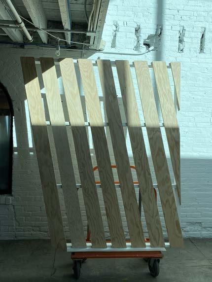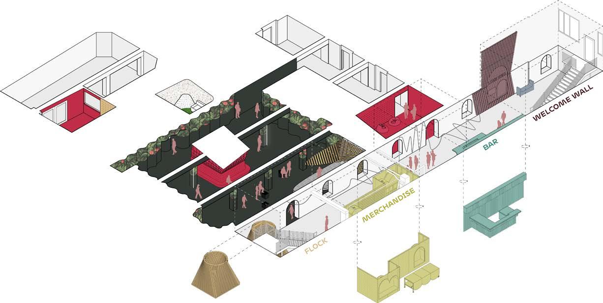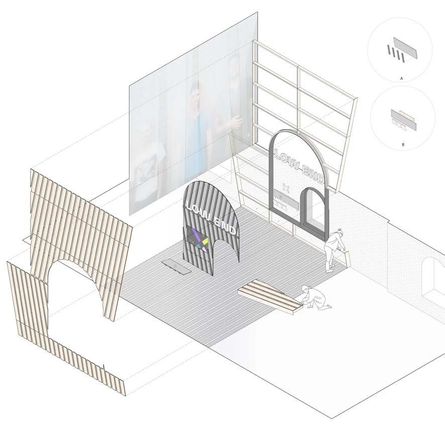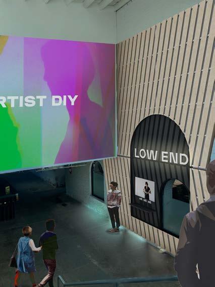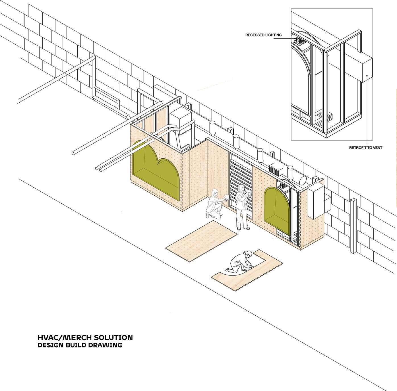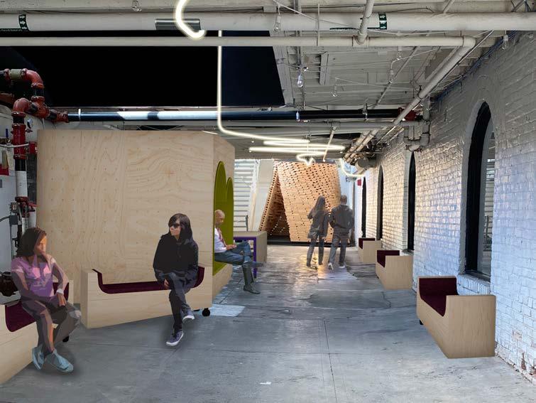 The groups mission was to activate the pre-event space to Bemis’ LOW-END performance venue into a welcoming and comfortable area for both artists and patrons. Our team worked to elevate this space into a comfortable, easy to navigate, inviting area for patrons and artists alike. The dramatic changes in ceiling heights split the space into different programs. The design includes several additions to enhance the experience of visitors to the performance space. These features include way-finding lights, a check-in station, ample seating, and a merchandise display wall for artists. In addition to providing an area to showcase merchandise, the display wall will also act as a sound barrier to minimize the noise from the HVAC system. To maintain consistency with the existing design, archways will be incorporated to create a rhythmic flow along the linear path. It will also echo the materiality of past design solutions through plywood, the precise use of color-existing and addedpatterns such as slats and pegs. Ultimately, the aim is to create spaces where visitors feel comfortable pausing and inhabiting the space.