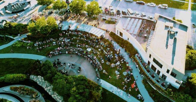 An amphitheater is a space that community can gather for bigger events such as concerts, comedy shows, and presentations. When the space isn’t being used for large gatherings, it provides tiered seating to read or hang out with friends.