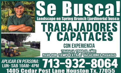 SE BUSCA: LANDSCAPE EN SPRING BRANCH. /Capataces/ Trabajadores. Tiempo completo, Todo el año asegurado! Aplique llamando al: 713-932-8064