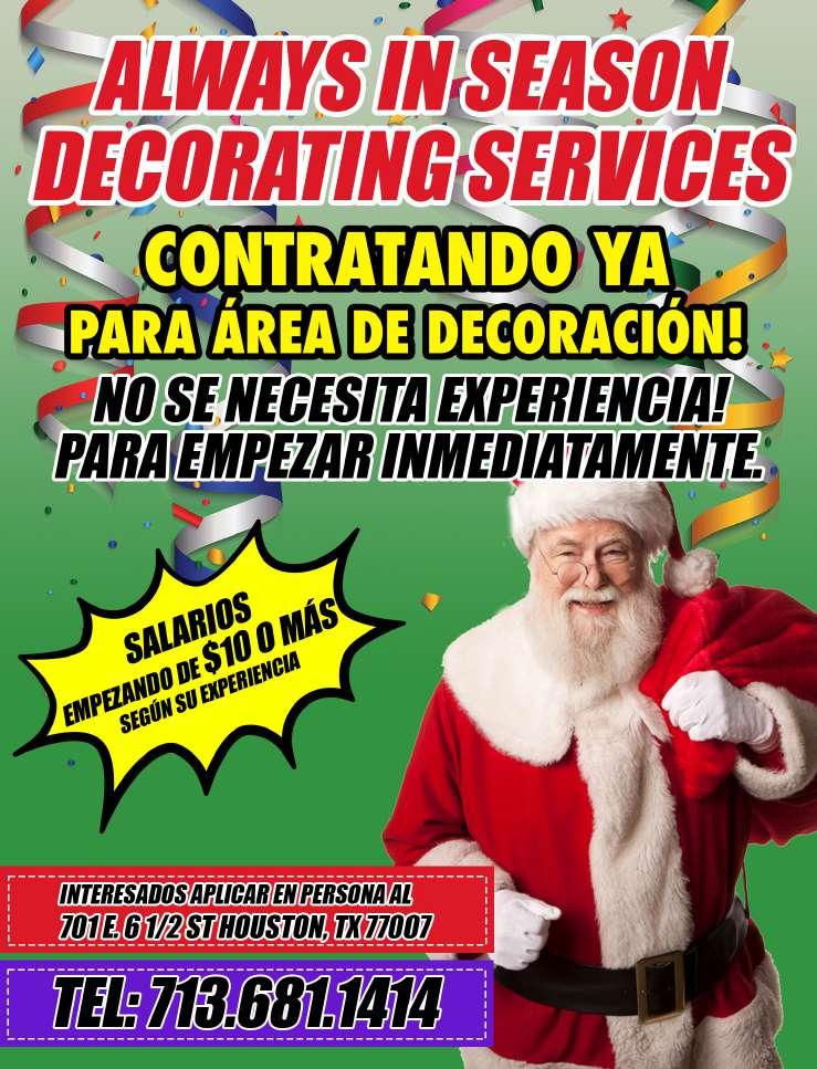 SE ESTA CONTRATANDO, varias posiciones disponibles. Decoradores, instaladores, boom lift y más. Llama al 713-681-1414
