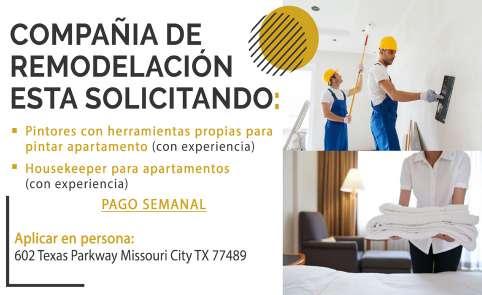 COMPAÑIA DE REMODELACIÓN Esta solicitando, Pintores y housekeepers. Llamar al 832-788-9259