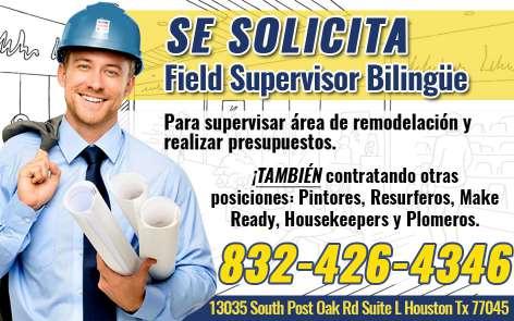 SE SOLICITA, Maestro y ayudante, con experiencia en remodelaciones de casas. Llamar al 832-202-4938
