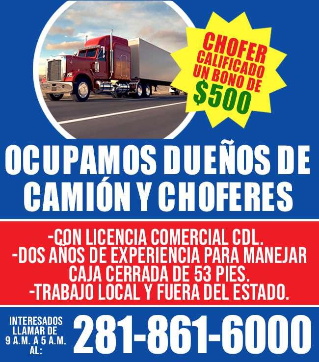 ESTAMOS CONTRATANDO, Choferes con licencia de Texas. Interesados al 281-487-0606