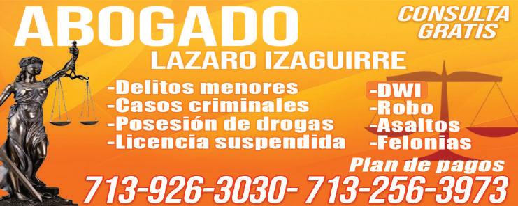 ABOGADO LÁZARO IZAGUIRRE te ayuda con delitos menores, casos criminales, licencias suspendida, DWI, robo, asaltos, felonias. 713-256-3973