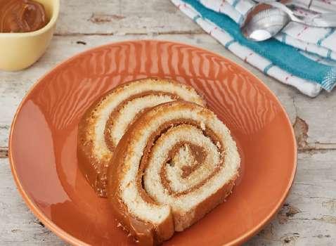 5. Echar el manjar encima del bizcocho y enrollar suavemente.