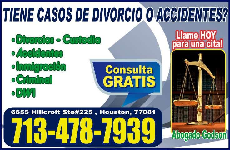 TIENE CASOS DE DIVORCIO O ACCIDENTES ? El abogado Godson te ayuda en casos de divorcios, custodia, accidentes, inmigración, criminal, DWI. Llama al 713-266-2223
