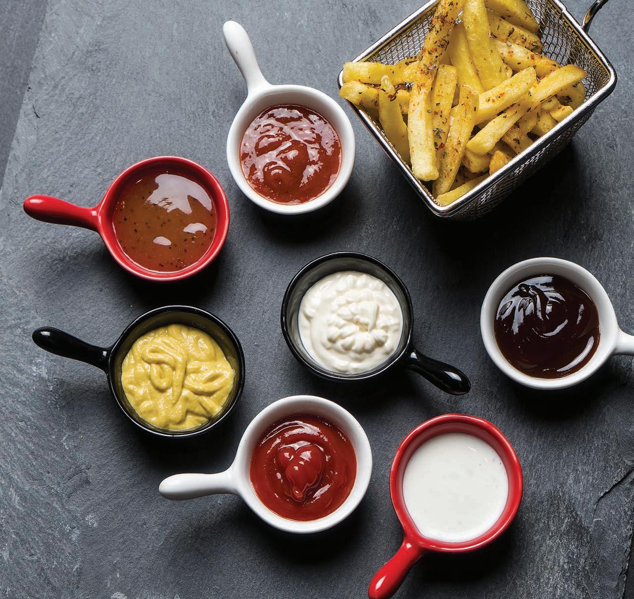 UPCHARGE FOR A FRY BOARD FEATURING A VARIETY OF SHAPES AND SAUCES.