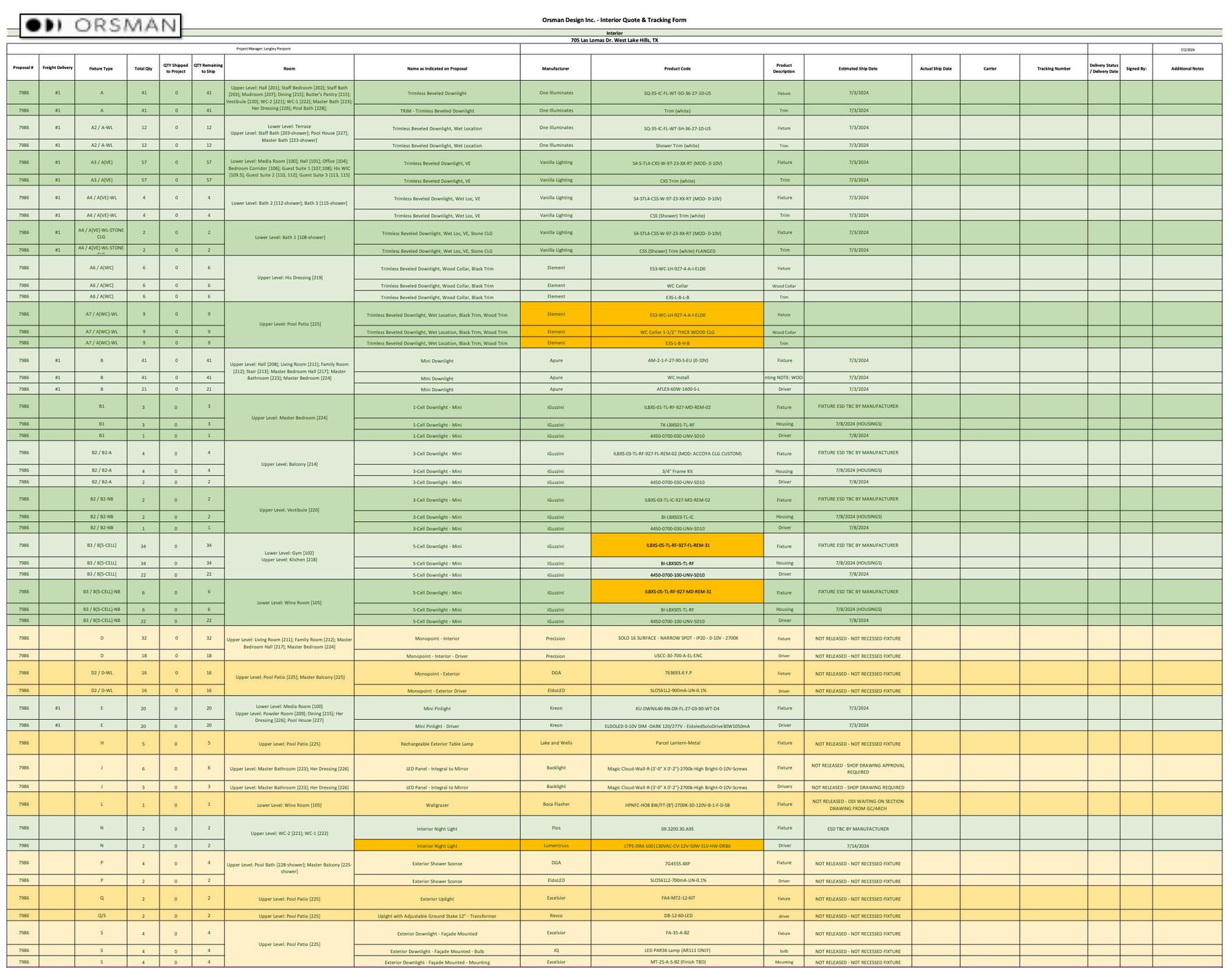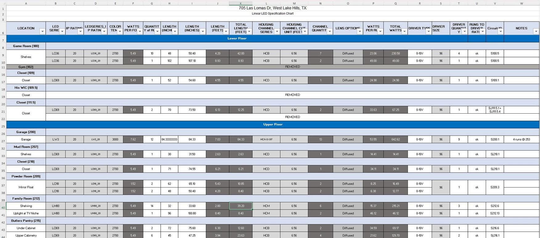 Comprehensive schedule of linear locations throughout project, track specification, IP rating, length, and quantity