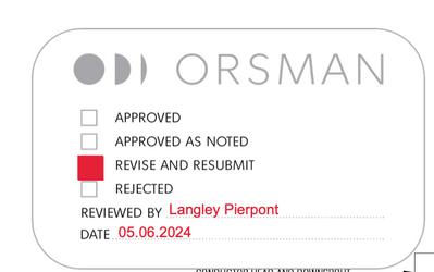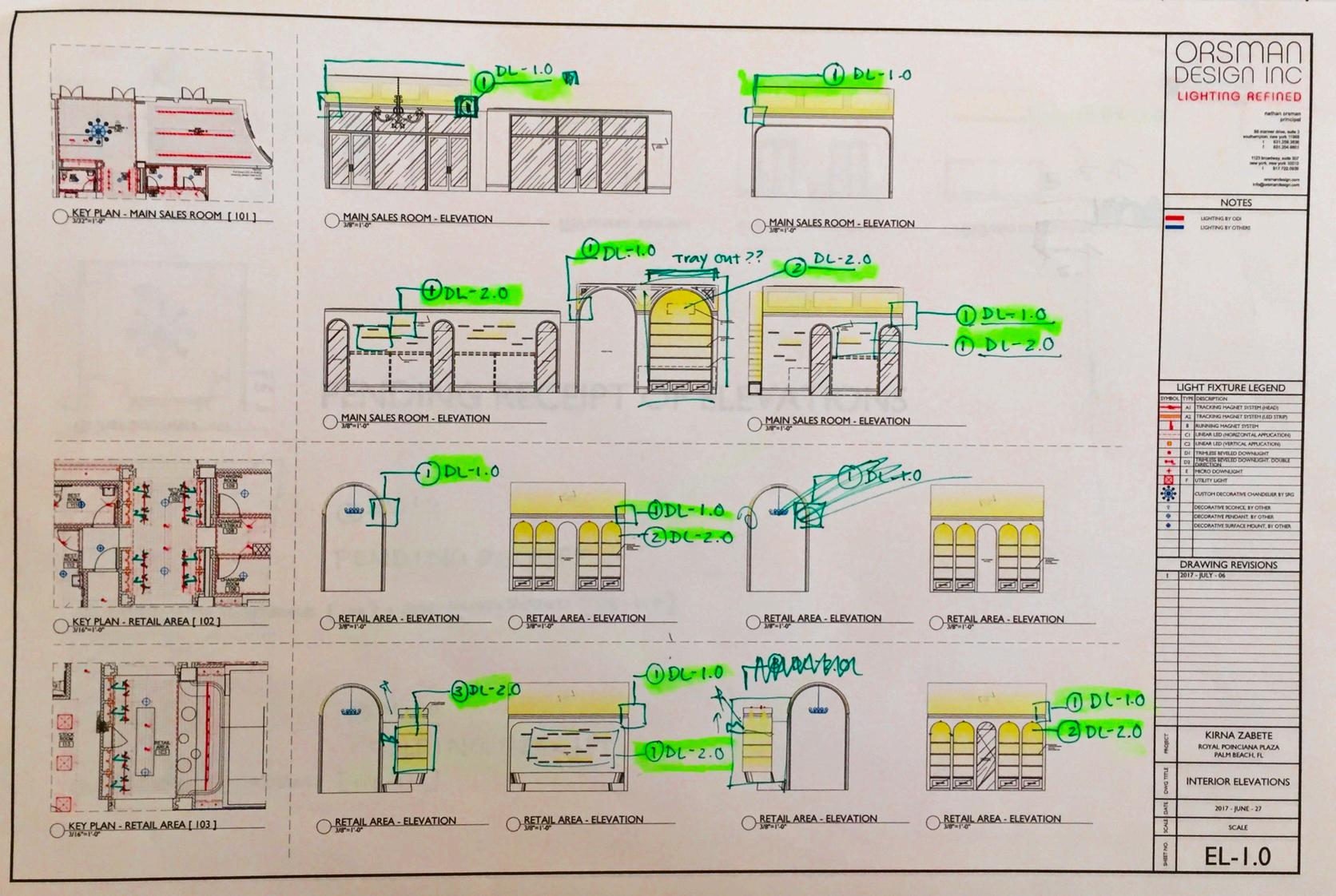 Review of all elevations and shop drawings to verify each lighting detail was caught and applied to millwork/stone work drawings Shop stamps indicating approval/revisions