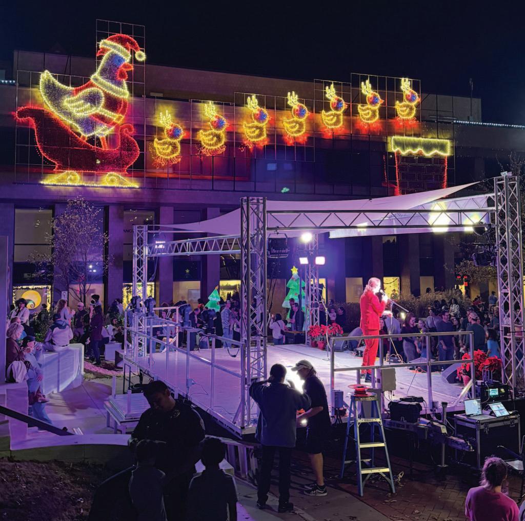 Crowds sing Christmas Carols during the lighting of the new version of the Big Chicken in downtown Gainesville last