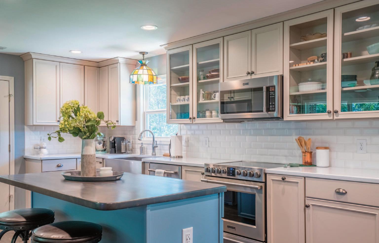can uplift the whole feeling of a home for homeowners and guests. According to Better Homes & Gardens, “Blue is a perennially popular paint color, and that’s no exception for kitchen cabinets. Found frequently in nature, subtle shades of blue are the perfect pairing with other neutrals like white, cream, and wood tones. That’s one reason why blue cabinets are a lasting kitchen cabinet trend. For a no-fail combination, pair dusty blue cabinets with natural wood accents and industrial materials.”