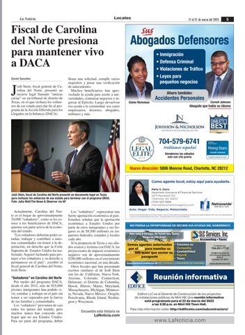 2 15 al 21 de marzo del 2023 Locales 4801 E. Independence Blvd., Suite 700, Charlotte, NC 28212 “Edificio dorado” Primera CONSULTA GRATIS Hacemos todo tipo de casos de inmigración LEY CRIMINAL Y CIVIL • Accidentes de carro • Accidentes de trabajo • Divorcios • Fianzas de inmigración • Casos familiares • DWI-DWLR, no licencia • Casos por drogas y alcohol • Violaciones de tráfico • Violaciones de probatoria • Violencia doméstica Plan de Pagos Disponible Vamos a cortes de inmigración 704-569-9800