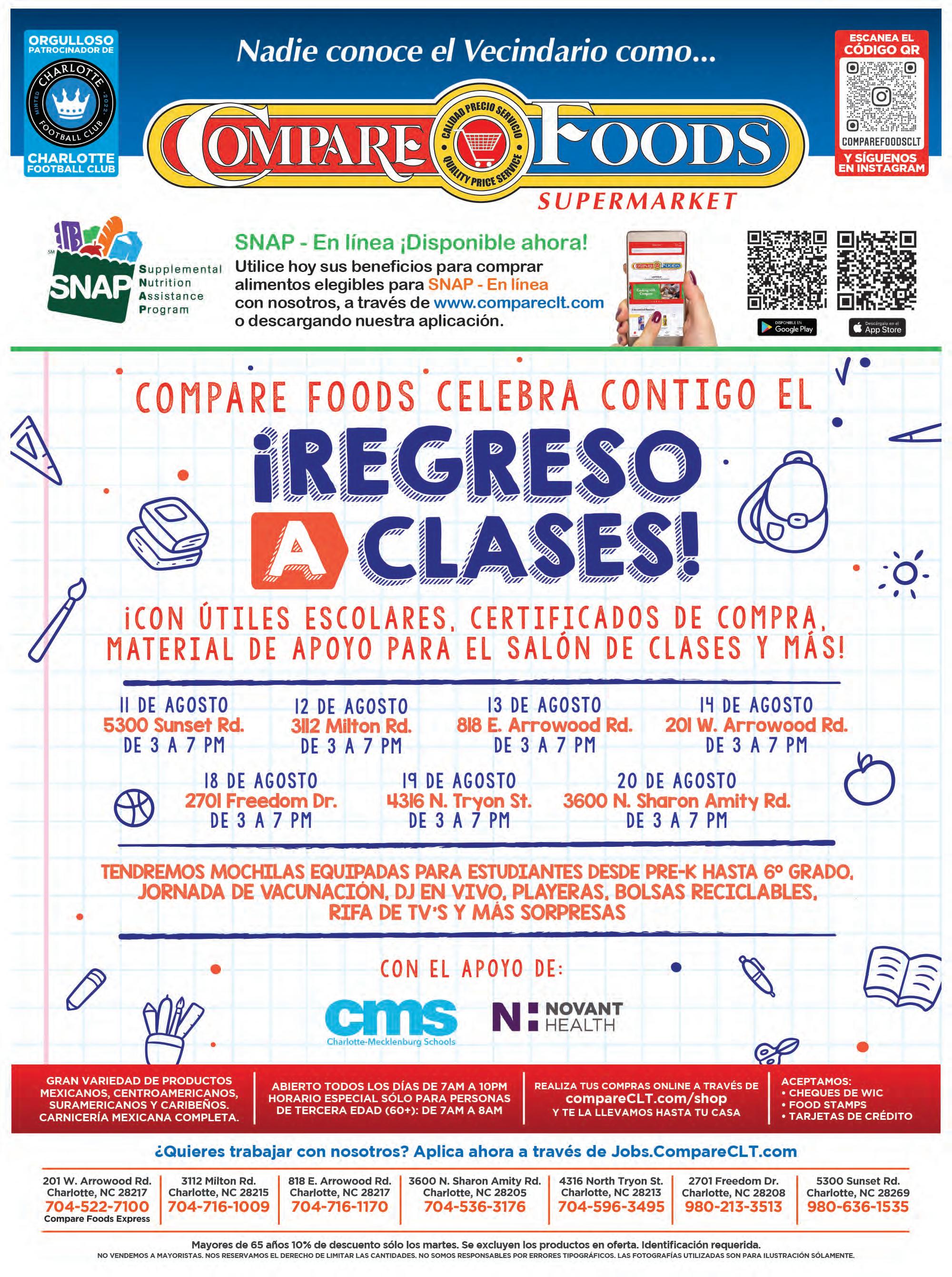El compromiso de las empresas locales con la educación de los niños es fundamental para el desarrollo de una sociedad próspera y equitativa. En esta ocasión, Compare Foods, en colaboración con el Sistema Escolar de Charlotte-Mecklenburg (CMS) y Novant Health, ha creado una campaña de regreso a clases destinada a brindar apoyo a las familias con niños en edad de Kinder y primaria. A través de la entrega de mochilas y útiles escolares, así como la asesoría en temas educativos y de salud, esta alianza estratégica busca asegurar que los pequeños tengan un inicio académico exitoso y saludable en el año escolar 2023-2024.