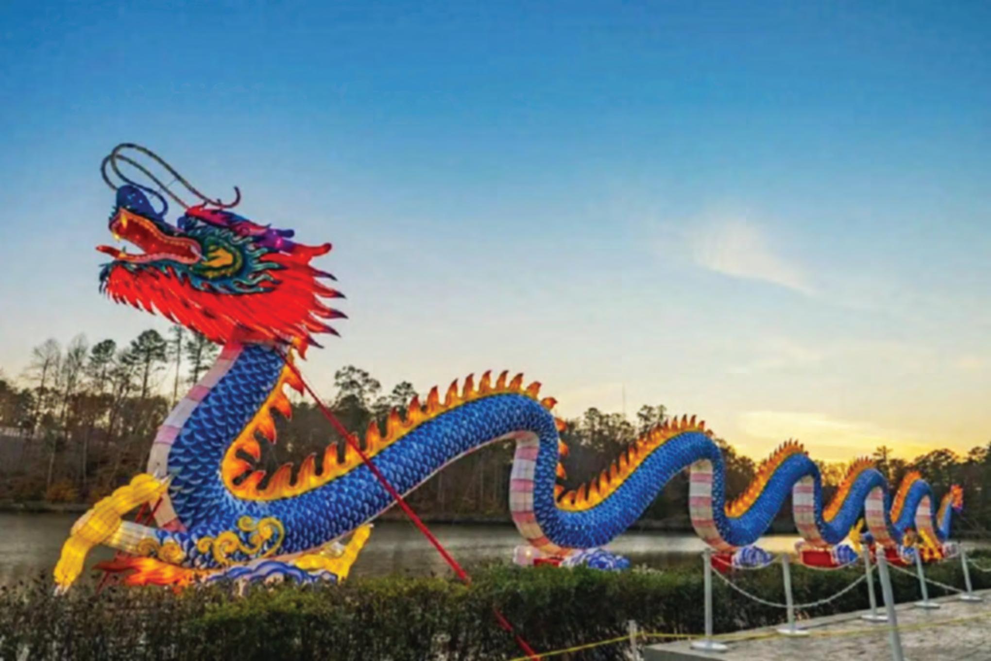 Este año habrá un dragón que flotará en Symphony Lake y promete ser más largo que tres autobuses escolares juntos, con un total de 200 pies, 21 pies de alto y un peso de más de 18,000 libras.