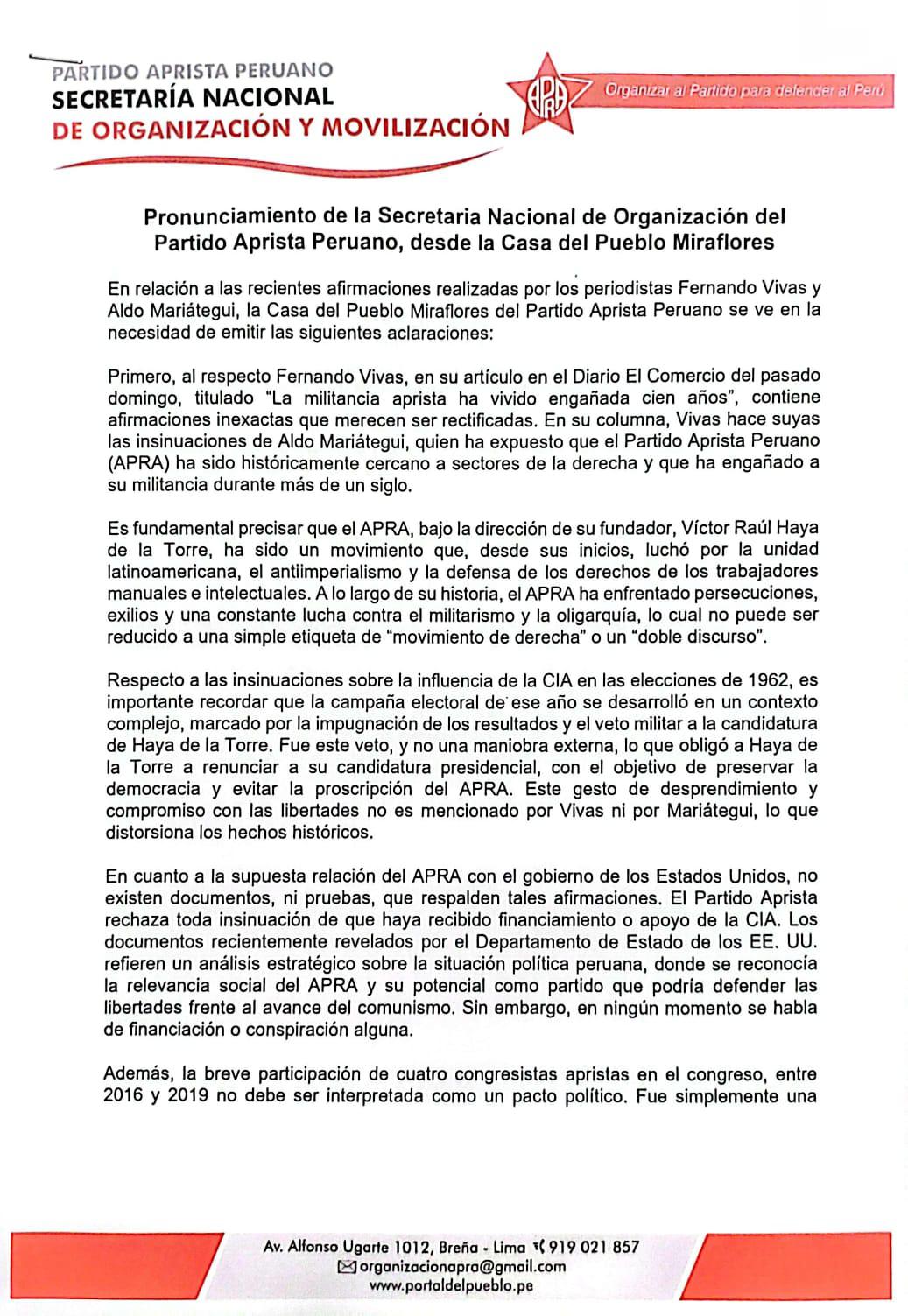 Lo que hace la CIA -y lo sigue haciendo- es un análisis general de partidos políticos en cualquier parte del mundo. En 1962 tocaba al Perú, por ello la mención al APRA y a los demás partidos, que Aldito no muestra. Respecto al analista gringo dice que le “resultó más izquierdoso de lo que creía”. Es que, sin duda, dejó de verlo en alguna etapa de su crecimiento.