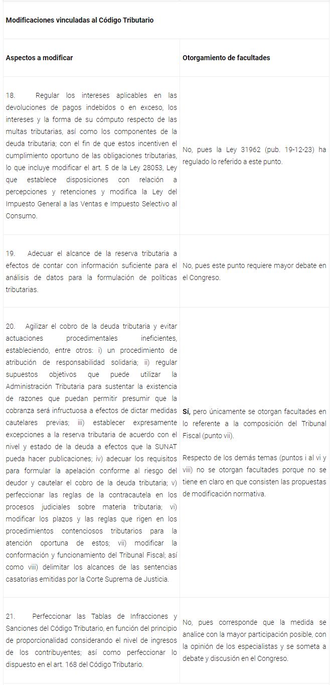permanente en el país y, el otorgamiento de un fraccionamiento especial para deudas administradas por la SUNAT que constituyan ingresos del Tesoro Público exigibles hasta el 31-12-23. A continuación, presentamos una tabla resumen con las materias respecto de las cuales se otorgarían o no facultades y la razón de la negativa: