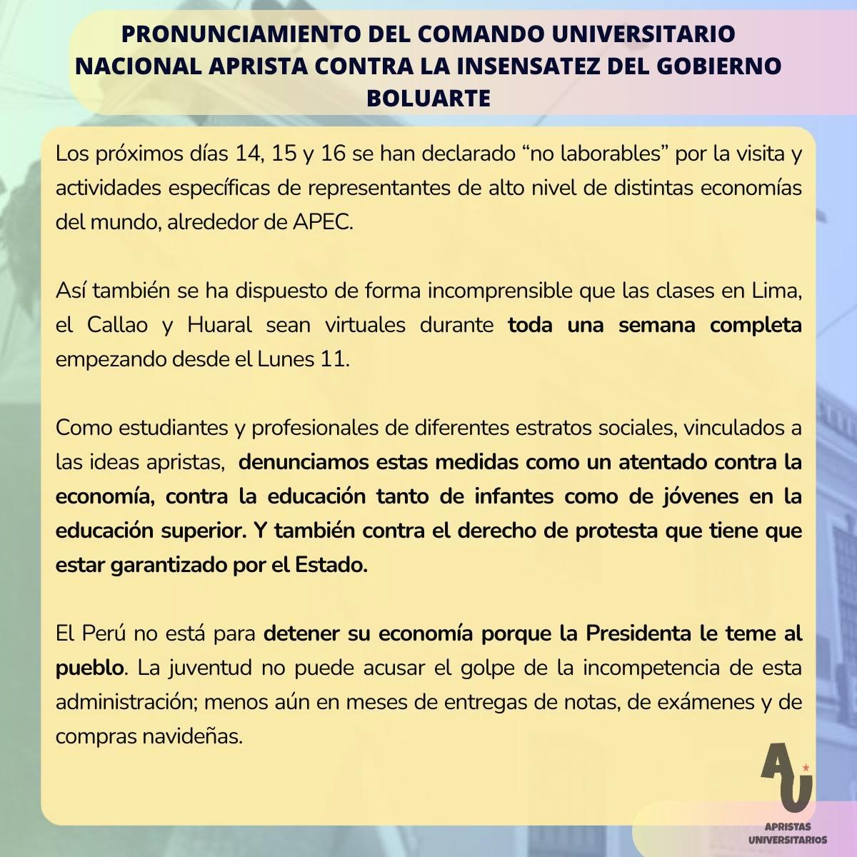 “No me siento representada en estos momentos ni por la comisión política ni por el SEN y muchos militantes adolecemos de lo mismo, de ese sentimiento de NO representación porque ya no hay democracia en ese CEN, los personajes que están ahí ya hace tiempo venció su plazo y no ha sido un congreso democrático el último, no están convocando un congreso a tiempo para prepararnos para el 2026, entonces no estamos representados y estamos solo por lealtad a Haya de la Torre. Yo me he re-inscrito en el partido por segunda o tercera vez por lealtad a VRHT porque ninguno de los que están en ese lugar me representan ni han cuidado el edificio que es un edificio histórico que es el de la Av. Alfonso Ugarte como merece ser cuidado, no olviden que eso fue heren-