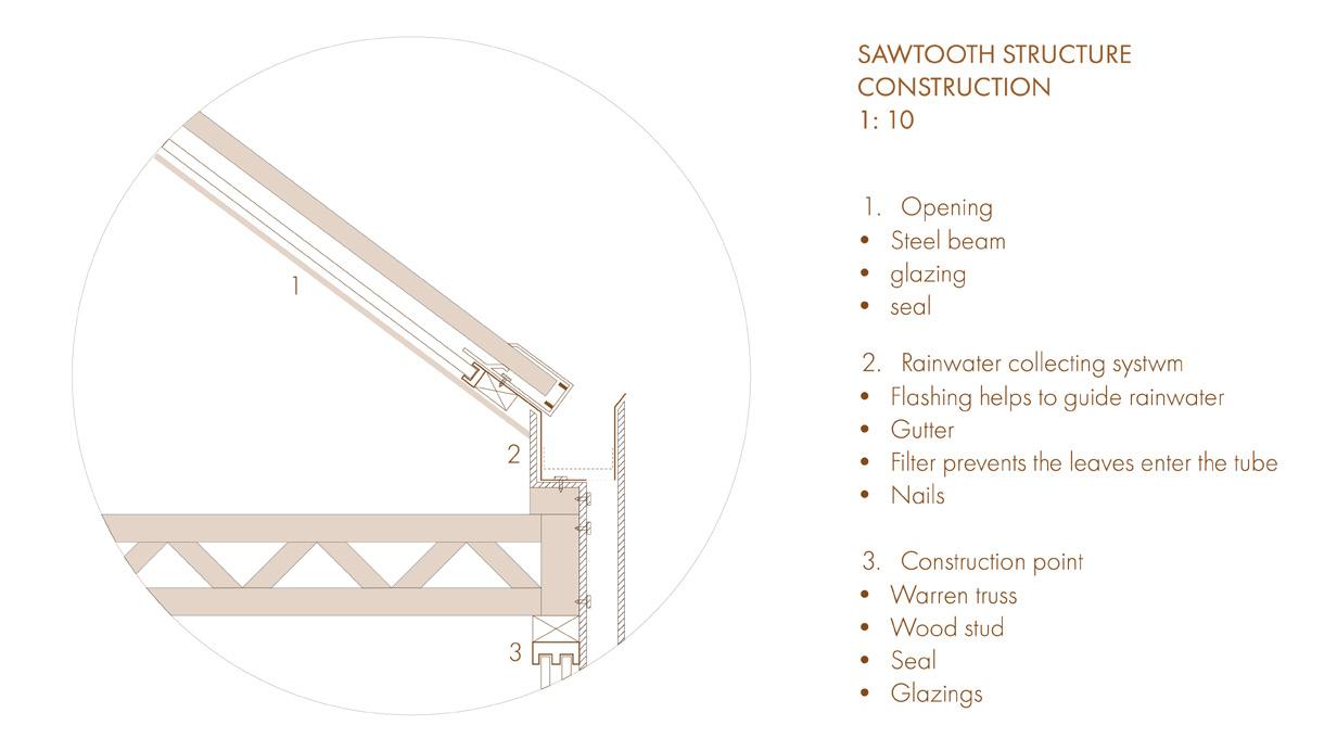 The different levels of roofs bring in sunlight to help the vegetation grow and provide shadows for the outdoor spaces.