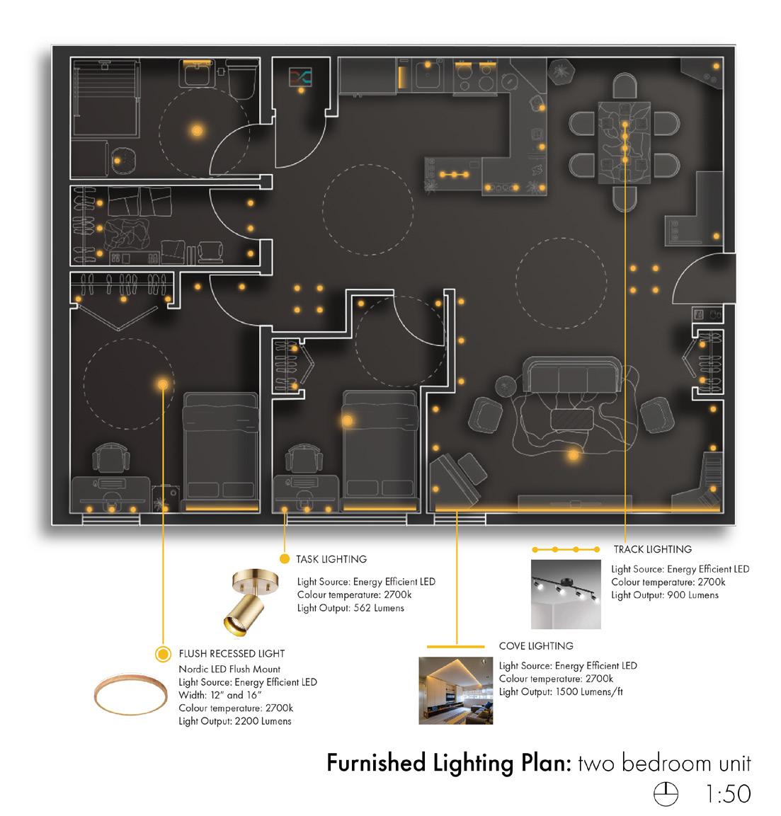 The lightings in the commercial spaces have a cooler temperature than the residential units.