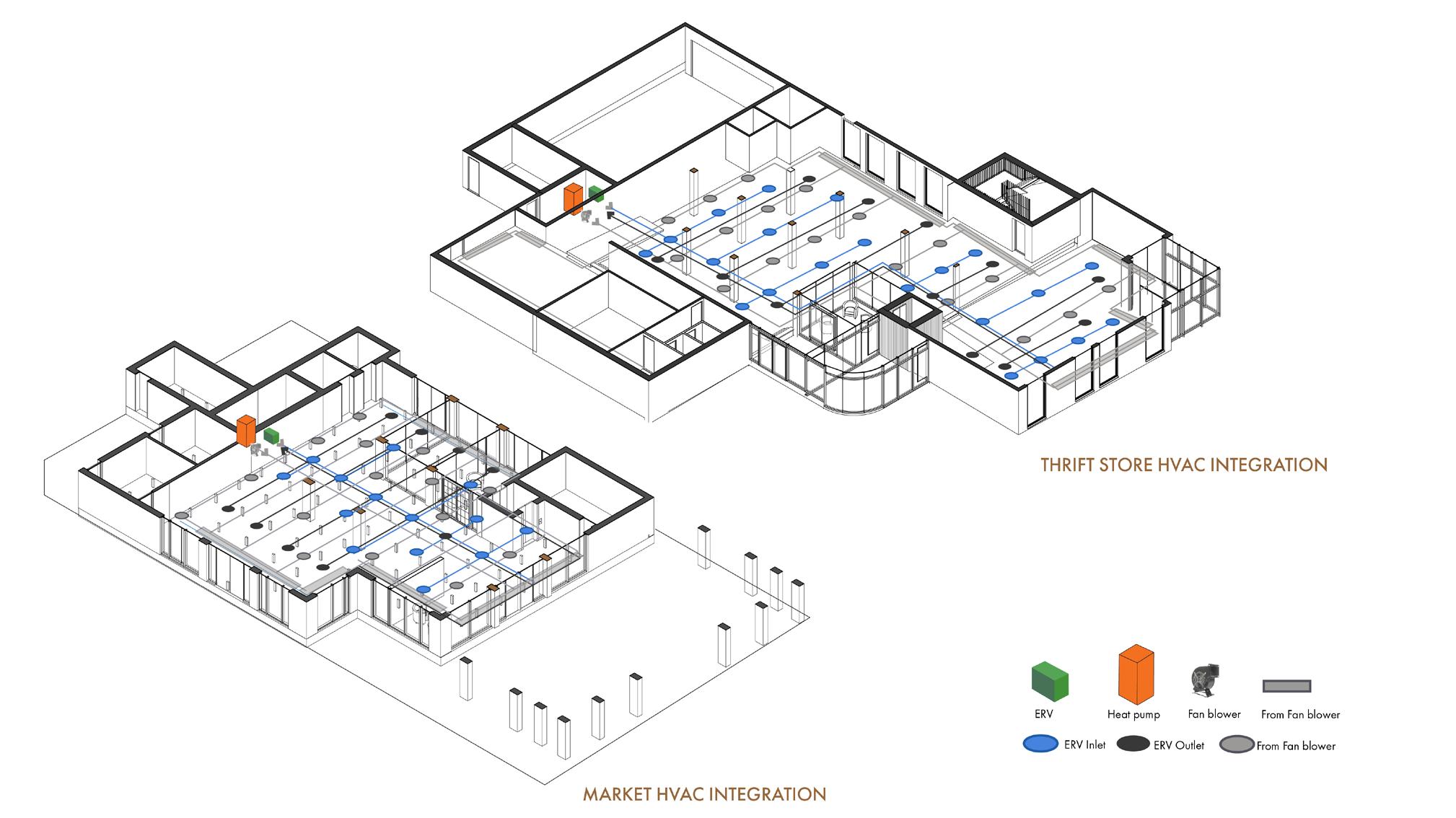 The commercial spaces have a water to air heat pump connected to a fan blower. All the vents, inlets and outlets are passed through the raised access floor.