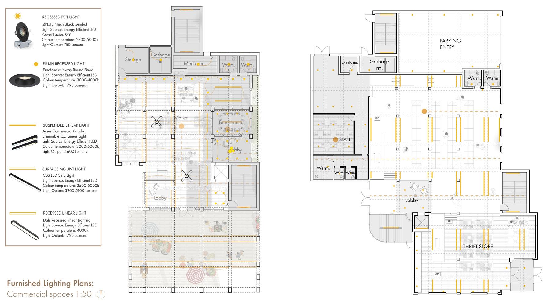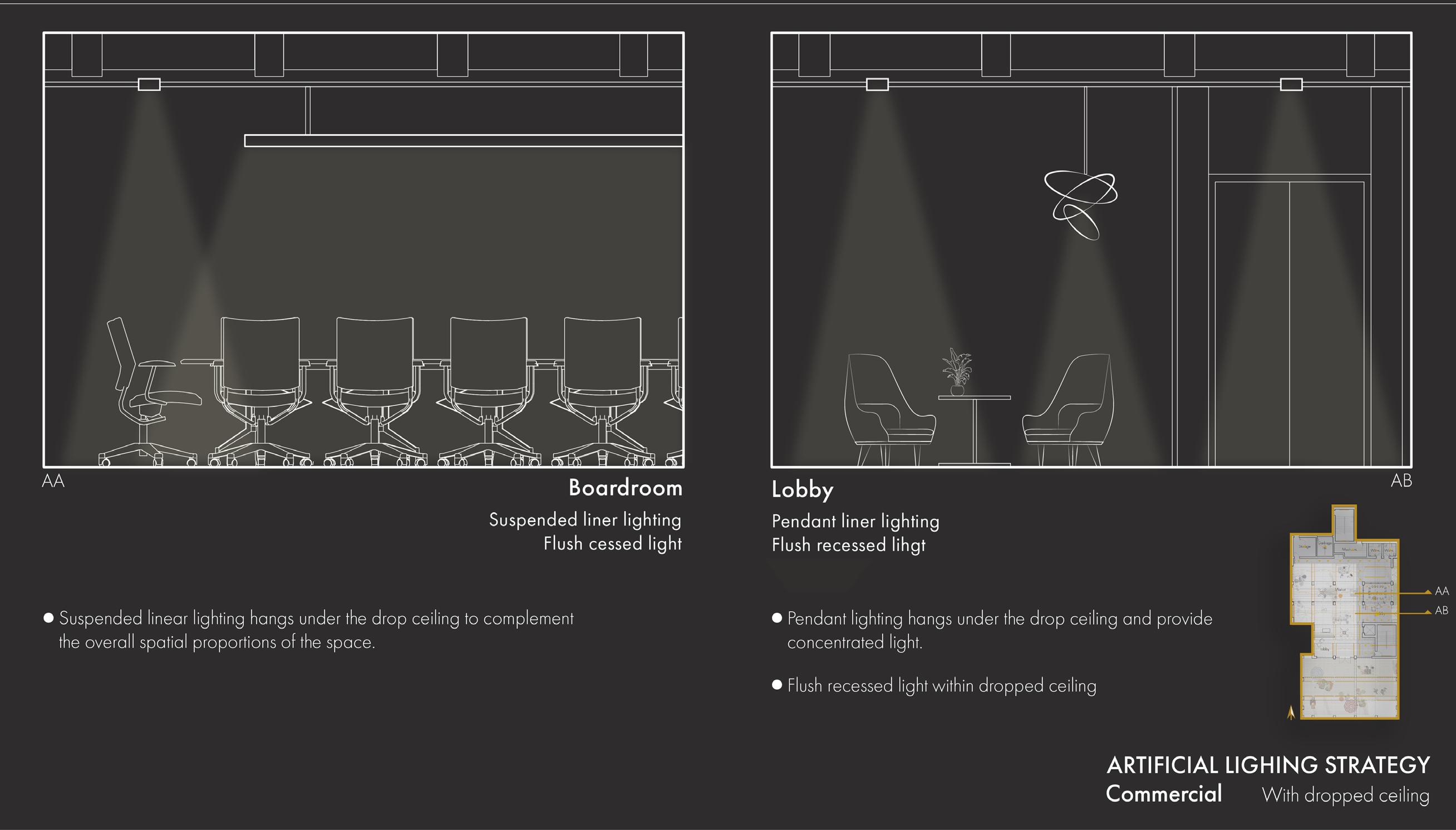 For the parts of the commercial spaces that have a dropped ceiling such as the lobbies and the boardroom in the market, flush recessed light are installed as well as hanging lights.