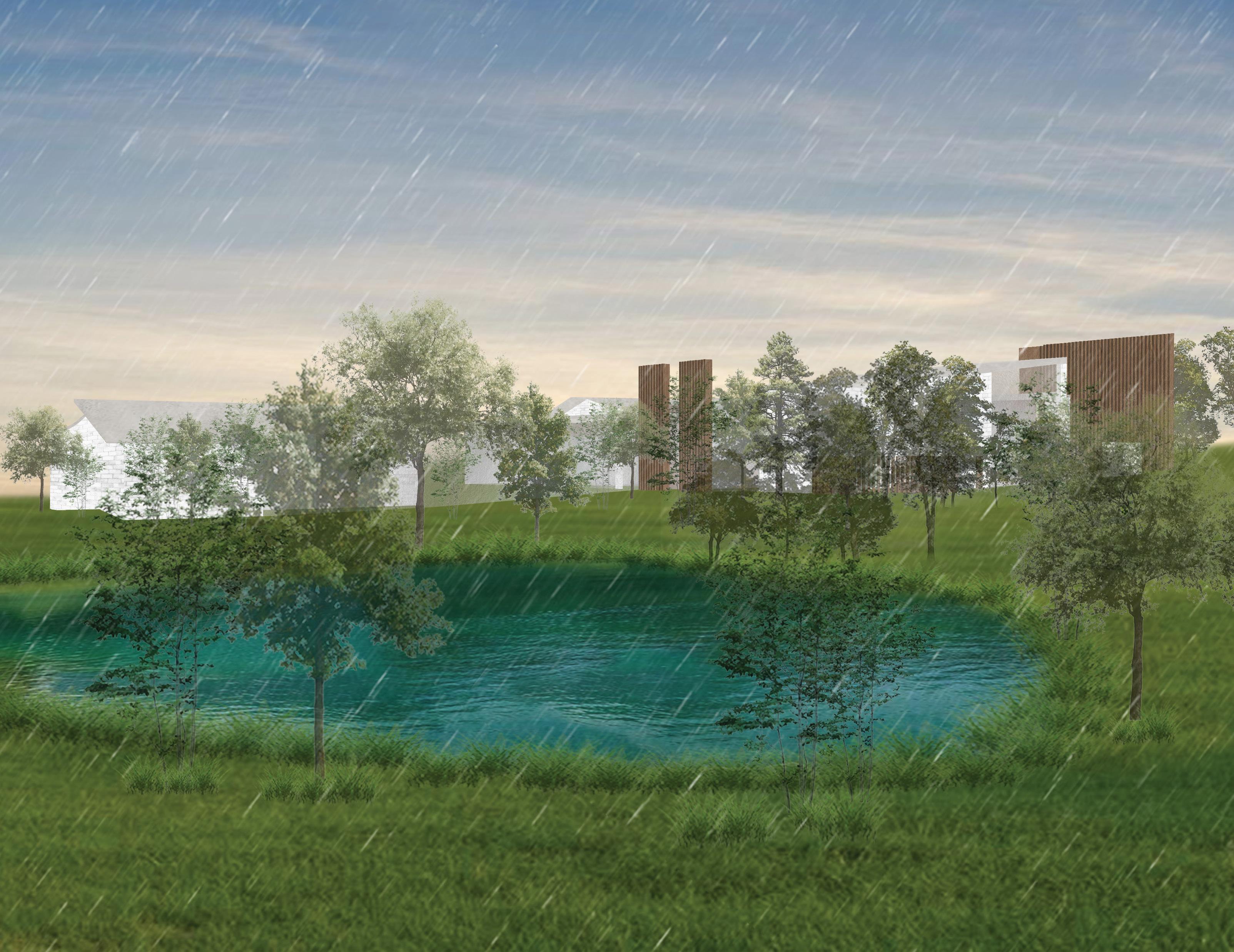 An artificial pond is created for outdoor activities, and make the scenery more interesting.