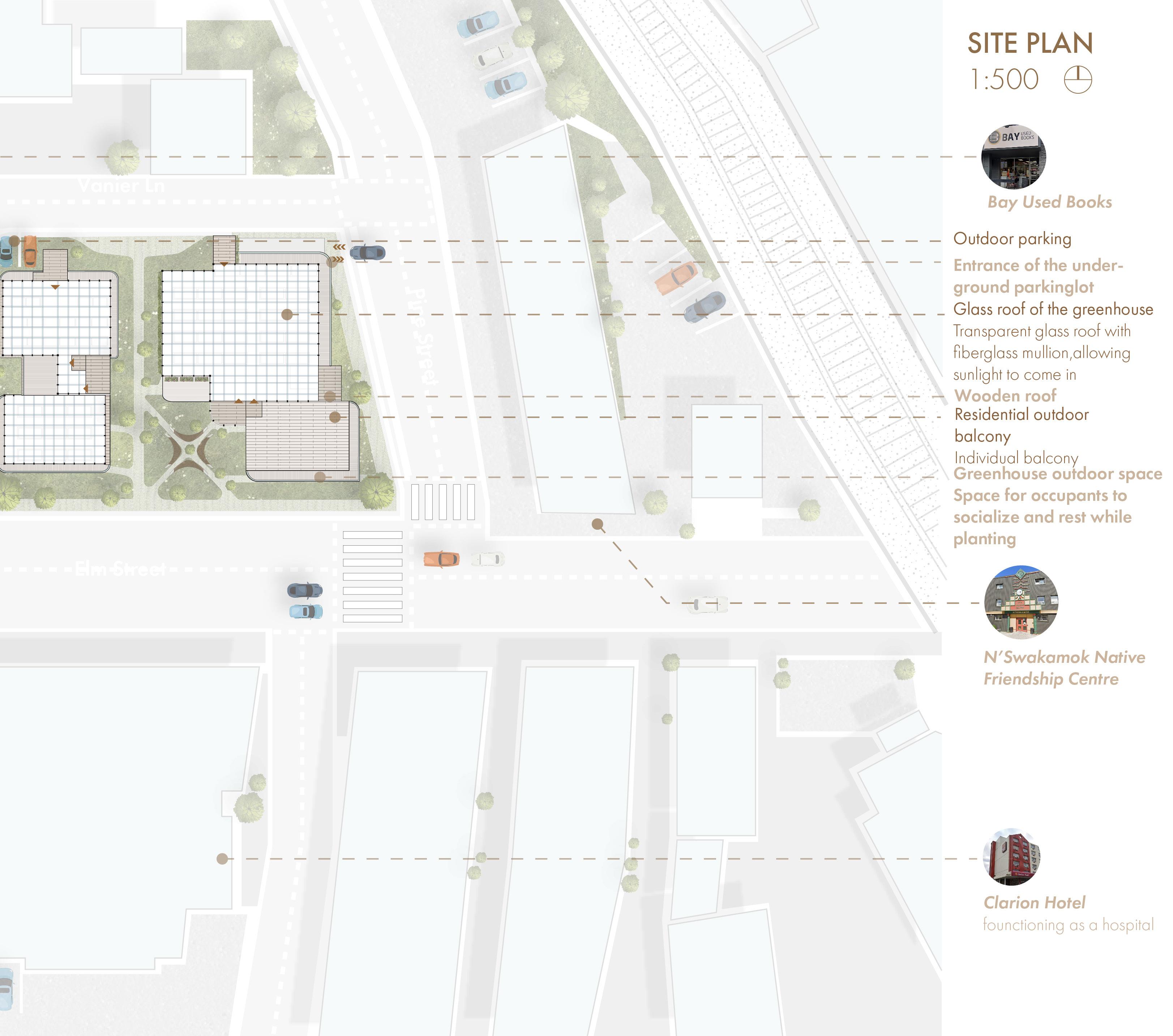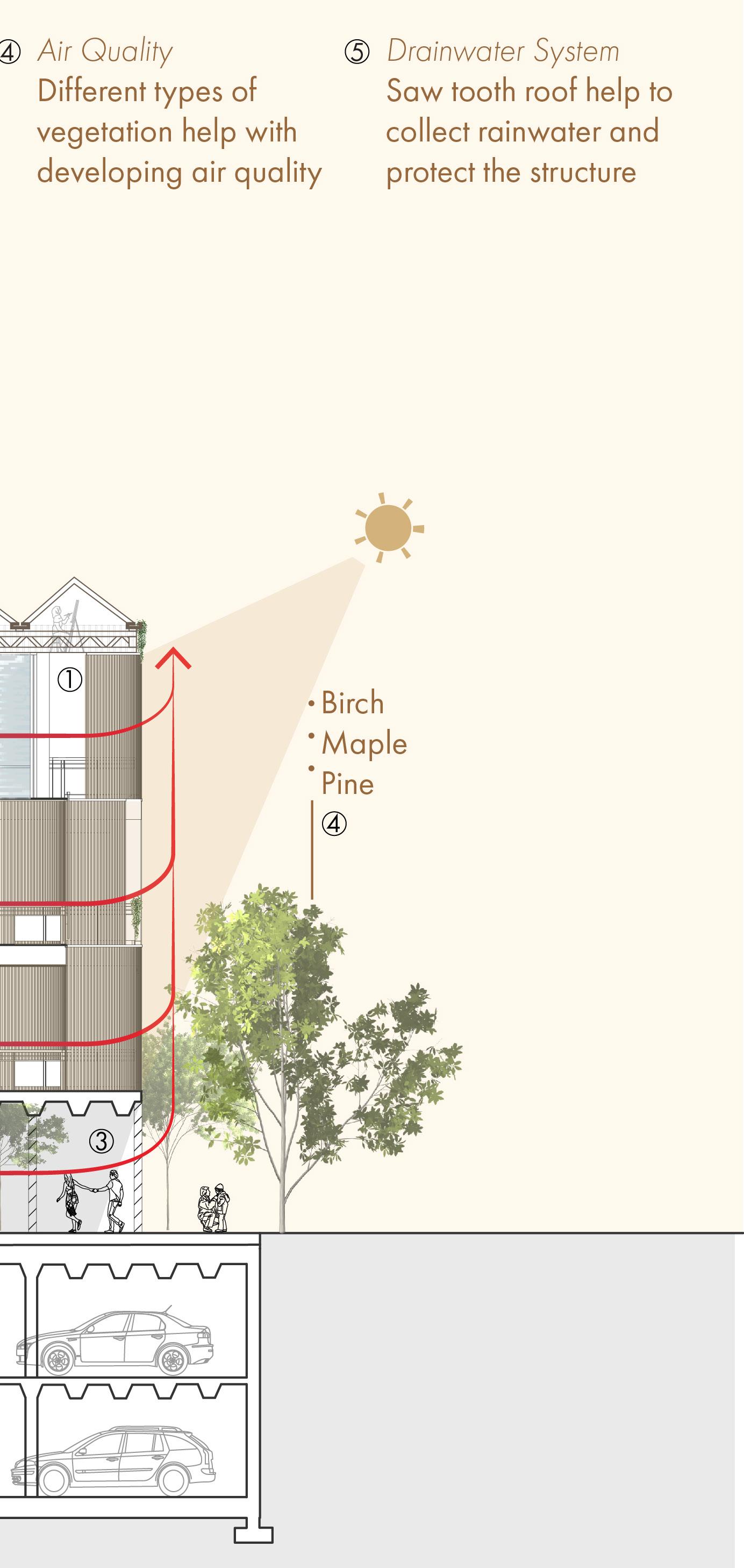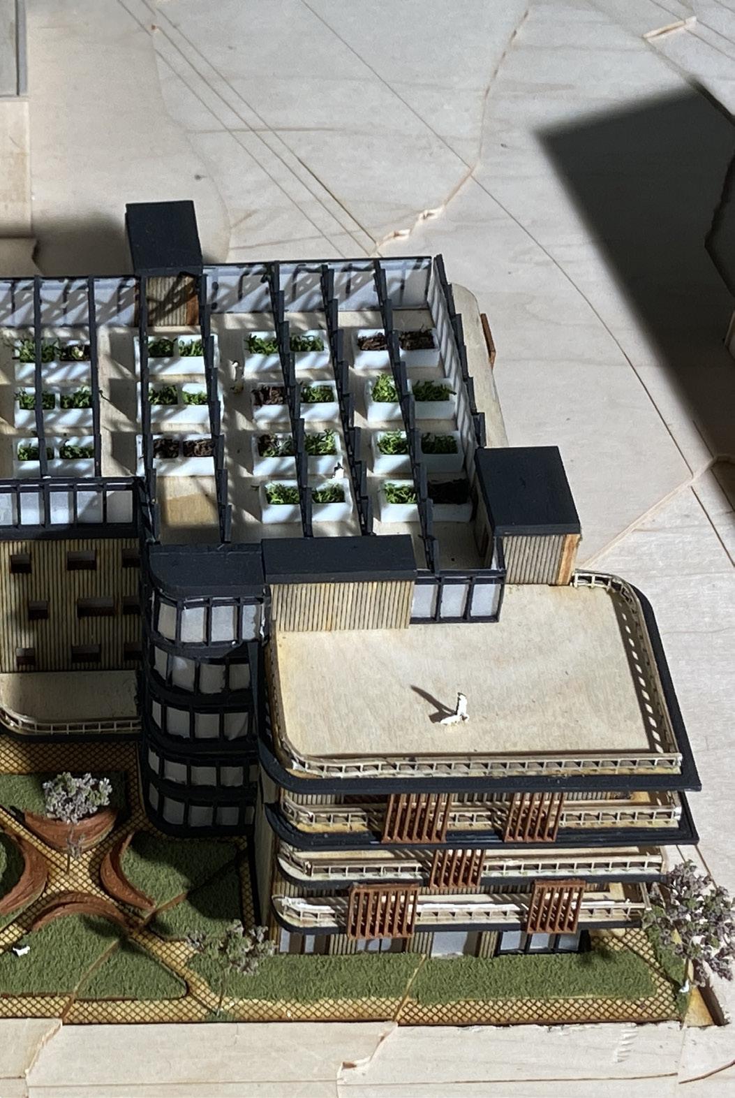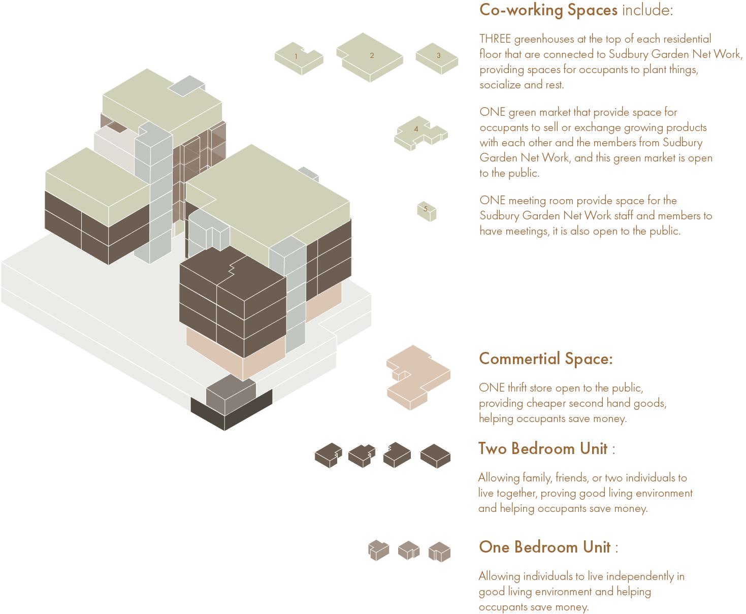 In addition, a market is located beneath the smaller residential building, which provides an area for the residents and/ or members of the Sudbury Garden network to sell and exchange food that they have grow.