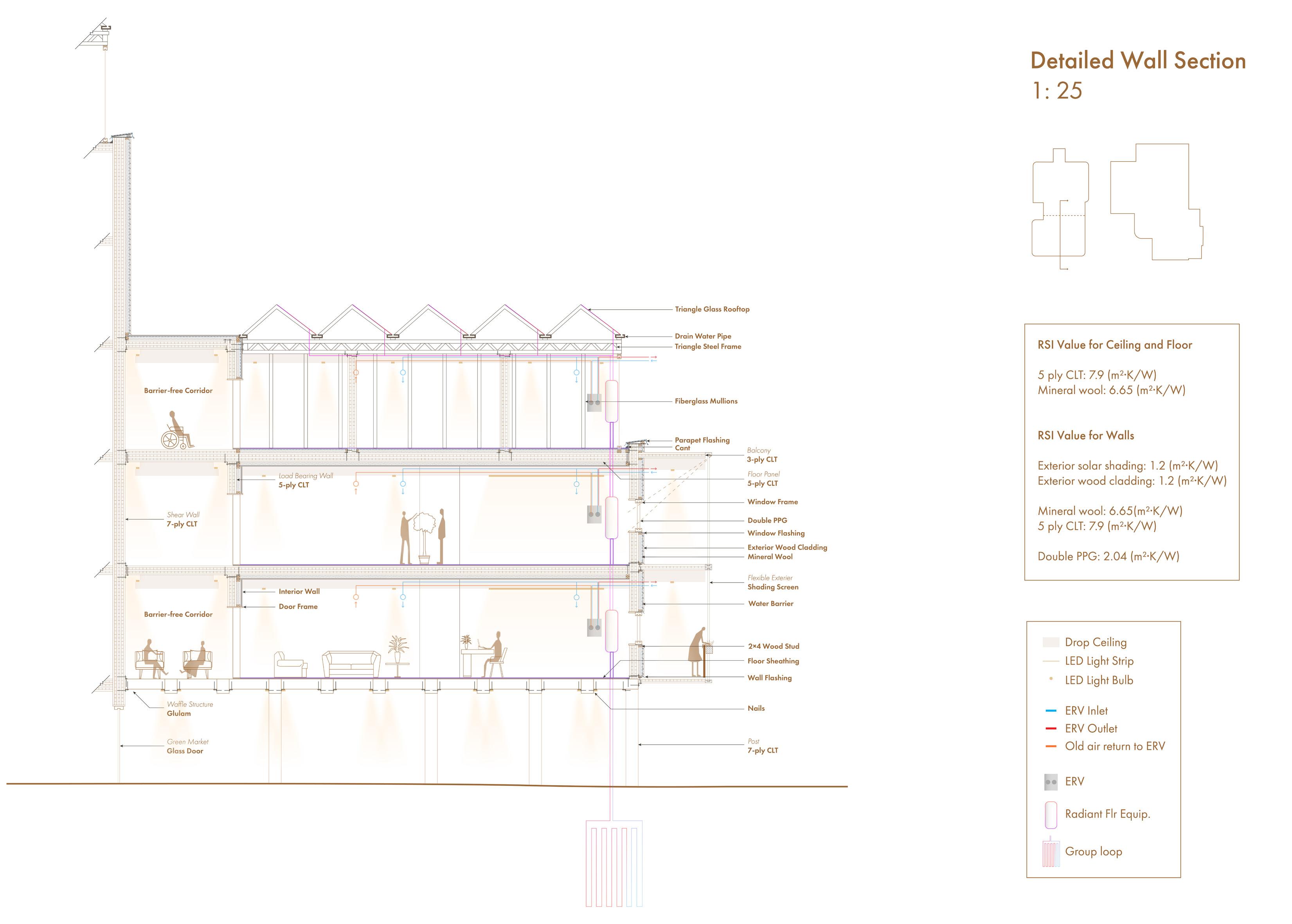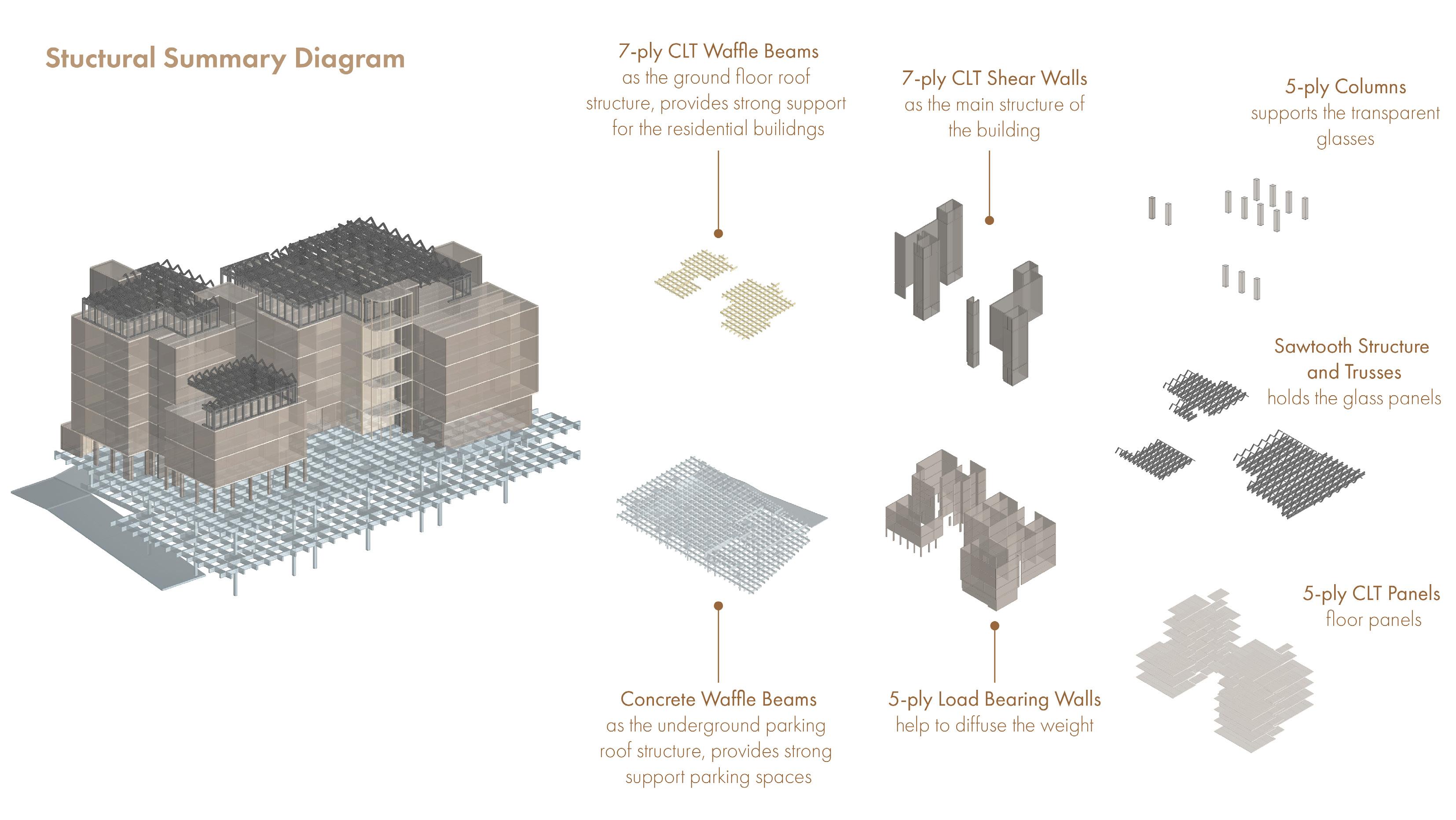 5-ply clt is used as the loeadbeaing walls, floor panels, and the greenhouse column. Glulam beam is used to build the commercial waffle structure.