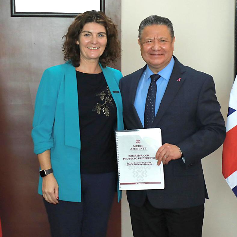 El gobernador de Hidalgo, Julio Menchaca Salazar, recibió de manos de la embajadora adjunta del Reino Unido en México, Rachel Brazier, la iniciativa de Ley de Cambio Climático para el estado de Hidalgo, que fue construida a partir de un ejercicio participativo encabezado por dicha representación diplomática y por la Secretaría de Medio Ambiente y Recursos Naturales de la entidad (Semarnath).