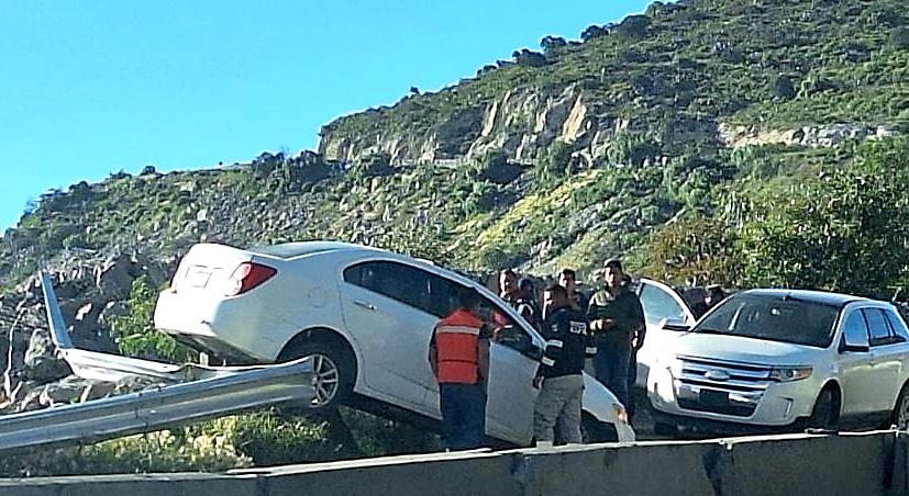 Autoridades informaron que fortuitamente para los ocupantes del automóvil Chevrolet Sonic, blanco, la barra de contención metálica evit ó que se fueran al voladero, lo que pudo ver resultado fatal para las personas, las cuales sí resultaron lesionadas.