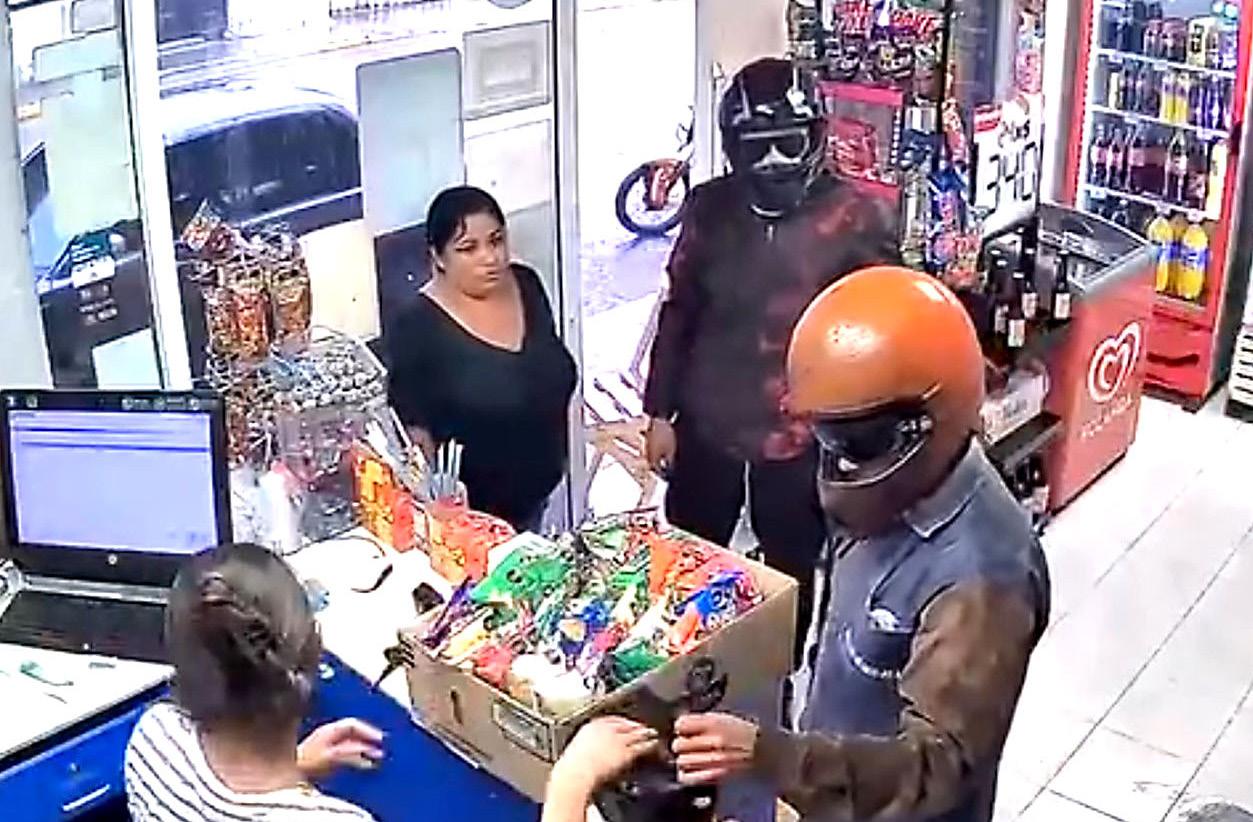 A plena luz de día, los dos sujetos entran al comercio con armas de fuego, amagan a un hombre que está en el lugar y exigen a la cajera que entregue todo el dinero.