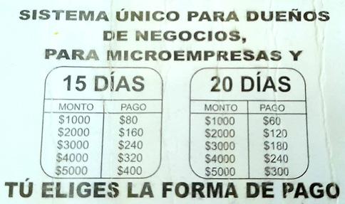 Hablan de la facilidad para entregar el dinero, pero jamás abordan el tema de los excesivos intereses, ejemplo: Por un préstamo de cinco mil pesos pagadero a 15 días, el deudor debe cubrir 400 pesos diarios, es decir, en la quincena debió haber cubierto seis mil pesos, lo cual representa un interés del 20 por ciento.