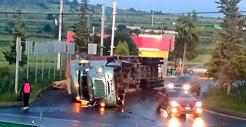 unidad con todo y la carga de madera. Explicaron que vieron zigzaguear la unidad, al parecer, el peso de la carga lo hizo caer en su costado.
