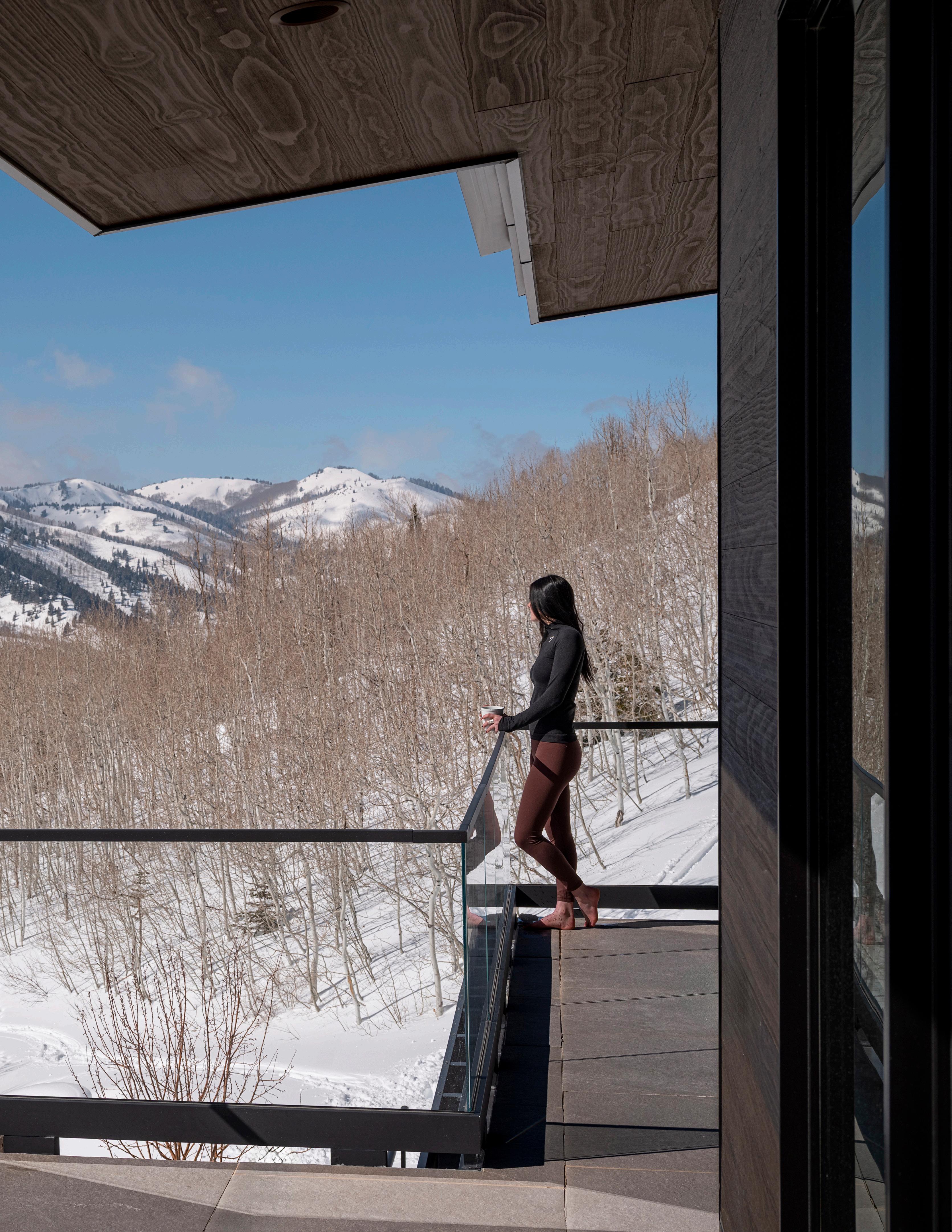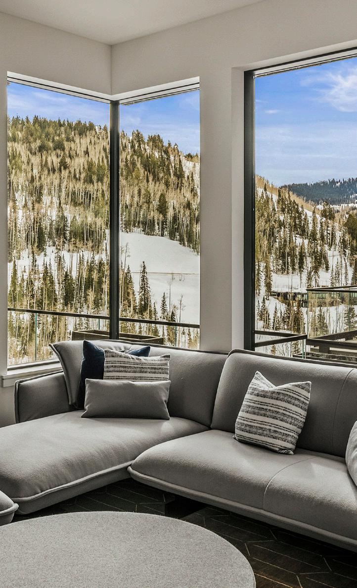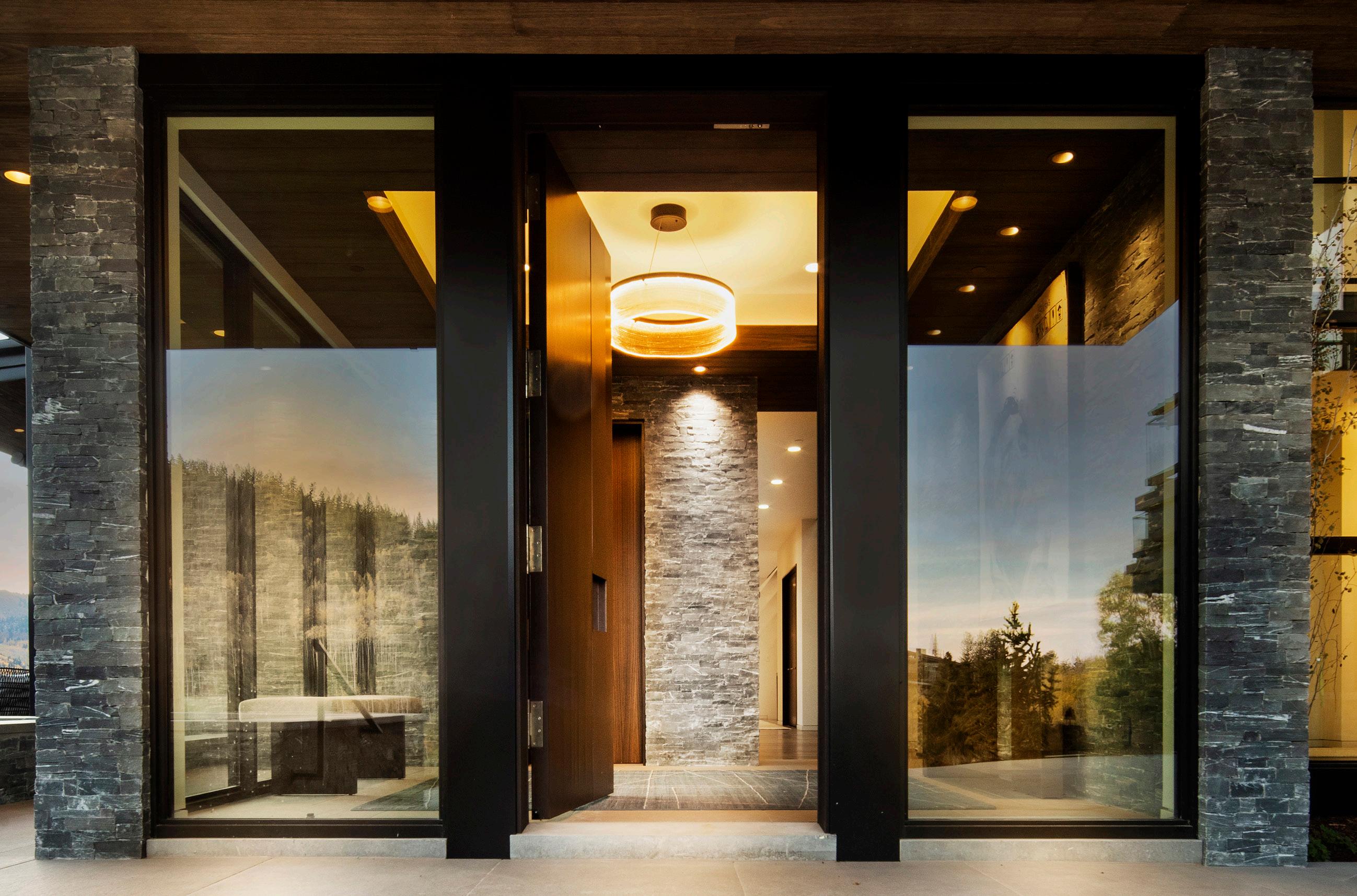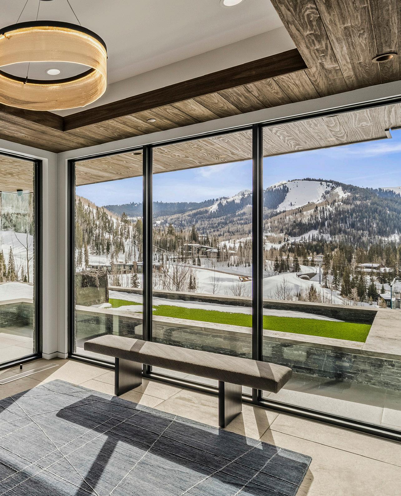 The expansive living room is a masterpiece, featuring floor-to-ceiling windows and 14’ integrated doors by Ultima Portugal, creating an effortless flow between interior and exterior spaces. Custom lighting by Jonathan Browning Studios & Hubbardton Forge, along with handcrafted wood floors, chandeliers, and sconces, introduce a contemporary mountain style that is both warm and inviting.