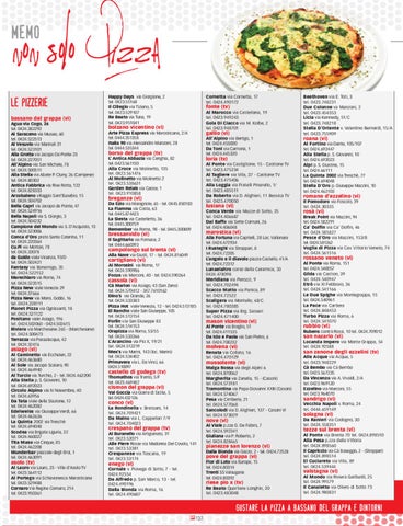 Agua via Cogo, 26 tel. 0424.382292 Al Saraceno via Museo, 60 tel. 0424.522513 Al Vesuvio via Marinali 31 tel. 0424.523101 Alla Grotta via Jacopo Da Ponte 23 tel. 0424.227051 All’Alpino via San Michele, 78 tel. 0424.500511 Alla Stella via Abate P. Cluny, 26 (Campese) tel. 0424.80302 Antica Fabbrica via Riva Rotta, 122 tel. 0424.828333 Arcobaleno villaggio Sant’Eusebio, 15 tel. 0424.504702 Bella Capri via Jacopo da Ponte, 47 tel. 0424.524916 Bella Napoli via S. Giorgio, 3 tel. 0424.504232 Campione del Mondo via S. D’Acquisto, 13 tel. 0424.523006 Conca d’Oro prato Santa Caterina, 11 tel. 0424.220364 Cu.Pi via Motton, 78 tel. 0424.33078 da Guido viale Vicenza, 93/D tel. 0424.502421 Fantasy via Bonamigo, 35 tel. 0424.522152 Marechiaro via Roma, 74 tel. 0424.523515 Pizza New viale Venezia 29 tel. 0424.37666 Pizza New via Mons. Gobbi, 16 tel. 0424.228111 Planet Pizza via Ognissanti, 18 tel. 0424.521122 Positano viale Asiago, 196 tel. 0424.502060 - 0424.502615 Riviera via Marchesane 265 - (Marchesane) tel. 0424.500473 Terrazza via Passalacqua, 42 tel. 0424.32476