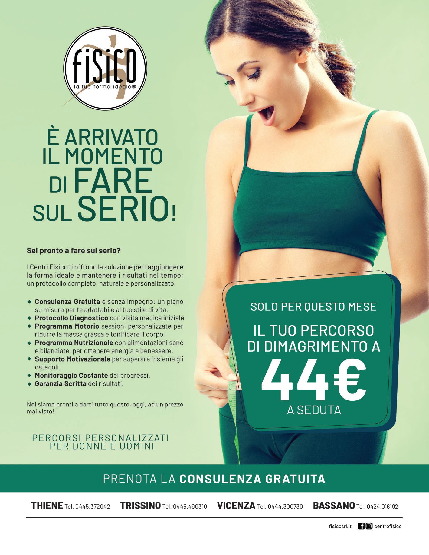 0424 505509 334 9454019 1 0 0 % GARANTITO P R E N O T A L A T U A C O N S U L E N Z A O M A G G I O L ' u n i c o m e t o d o i n f or ma s c r i t t a Scopri le storie vere di chi ci ha scelto! 10 ANNI DI CLIENTI SODDISFATTE V i a l e A s i a g o , 1 1 3 B a s s a n o d e l G r a p p a D a 1 0 a n n i , i l d i m a g r i m e n t o a B a s s a n o d e l G r a p p a UNA TAGLIA AL MESE con bikini intensive Perdi a d v s t u d i o e k a i t GARANTITO