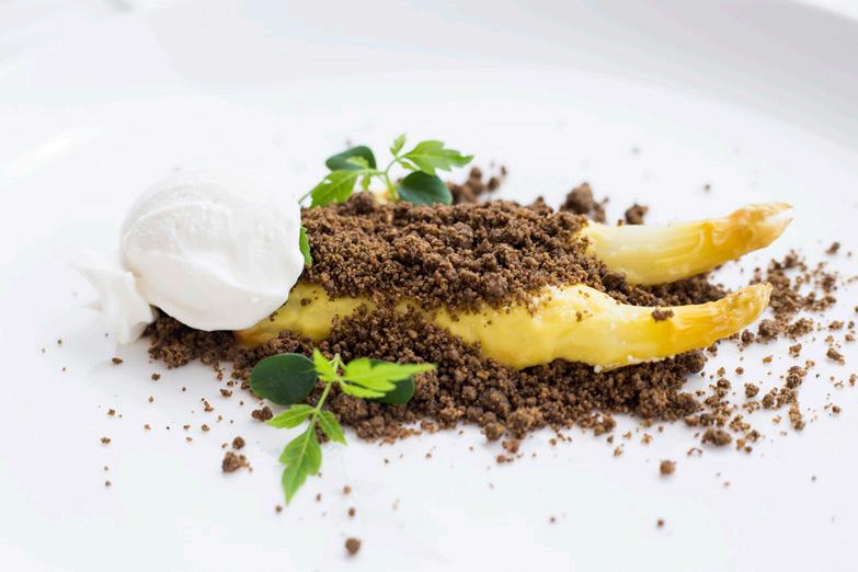 Tortino morbido di Asiago stravecchio con asparagi verdi e chips di guanciale