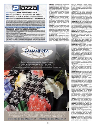 estivi per elementari e medie, compagnia disabili o anziani o come lavapiatti in zona Bassano e limitrofi. Per qualsiasi informazione telefonare al numero: 0424509905 •Ragazza 24enne, solare, amante dei bambini, con pluriennale esperienza offresi come baby sitter e/o aiuto compiti per bambini di elementari e medie. Disponibilità immediata, mattina o pomeriggio, automunita. Zona Bassano del Grappa, Rosà e dintorni.Per informazioni telefonare al numero: 3463705498 •Ragazza 25enne di Tezze sul Brenta offresi come baby-sitter. A breve laureata in scienze dell’educazione e della formazione della prima infanzia. Automunita con seggiolino, affidabile e creativa. Ho esperienza come baby-sitter e come educatrice presso asilo nido. Disponibile da subito. Tel. 3336581301 •Ragazza cerca lavoro come badante giorno/notte in zona Bassano del Grappa e limitrofi. 15 anni di esperienza pregressa, assicuro massima serietà. Tel. 3662585888 •Ragazza italiana 36 anni seria si offre come barista baby sitter badante ecc disp. immediata anche turni serali simpatia spigliatezza educazione e gentilezza. Telefonare al 3283752404 •Ragazza italiana di 22 anni con esperienza, cerco lavoro come baby sitter, aiuto compiti, pulizie e pet sitter, tanta voglia di lavorare zona Bassano del Grappa. Telefonare al 3420990207 •Ragazza laureata di 26 anni, seria, affidabile, paziente e automunita si offre come babysitter e aiuto compiti per studenti delle elementari e medie. Telefonare al numero 3468478154 •Ragazza marocchina 20enne, molto brava e seria cerca lavoro di assistenza anziani 24/24 nelle zona di Marostica, Bassano e dintorni. Per qualsiasi informazione telefonare al numero: 3891805300 •Ragazza ucraina 23 anni, molto brava e seria, cerca lavoro per assistenza anziani, 24/24 ore, pulizie casa, stiro ecc. nella zona di Marostica e dintorni. Tel. 3205690949 •Ragazzo 45enne residente vicino Marostica cerca lavoro come barista cameriere nel periodo luglio e agosto zona Marostica, Sandrigo e dintorni tel o mandare messaggio Tel. 3398266052 •Signiora 50enne da 14 anni in Italia, automunita, solare, dinamica, referenziata, brava cuoca, offresi come addetta pulizie, baby sitter, colf, stiro, assistenza anziani o altro purché serio. Disponibilita immediata nlla zona di Bassano e limitrofi. Telefonare al 3403766489 •Signora 46 anni cerco lavoro come stiro al mio domicilio o pulizie part time mattino sono seria capace e affidabile abito a Tezze sul Brenta. Tel. 3292907999 •Signora cerca lavoro come colf, assistenza persone e anziani, baby sitter, con referenze. No 24 ore. Disponibilità immediata. Zona Marostica, Sandrigo, Vicenza e limitrofi. Tel. 3206184291 •Signora di Marostica veneta, automunita, brava cuoca, seria, affidabile, mi offro a ore per aiuto persone anziane, referenziata. Tel. 0424708910 - 3345405147 •Signora georgiana brava, onesta, diligente, si propone per assistenza anziani, malati, anche non autosufficienti. Pulizia casa, cucina, commissioni, servizi e faccende. Tel. 3205310252 •Signora cubana con pluriennale esperienza nell’ambito dell’assistenza agli anziani, referenziata, seria ed affidabile, si offre come badante, anche 24/24, nella zona Marostica-Bassano-Nove. No perditempo. Telefonare al 34663145077 •Signora italiana cerca lavoro come badante per anziani autosufficienti no 24 h anche part time. Tel. 3442616826