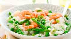 Un risotto semplicissimo e cremoso, veloce da preparare. Un piatto cremoso e saporito, caratterizzato dal sapore delicato degli asparagi freschi e dal sapore deciso dei gamberi. Ingredienti: 160 g Riso vialone nano; 200 g Gamberi; 120 g Asparagi; 1 Cipolla; 1/2 bicchiere Vino bianco; Prezzemolo; Timo; Brodo vegetale q.b.; Olio extravergine d’oliva; Sale; Pepe