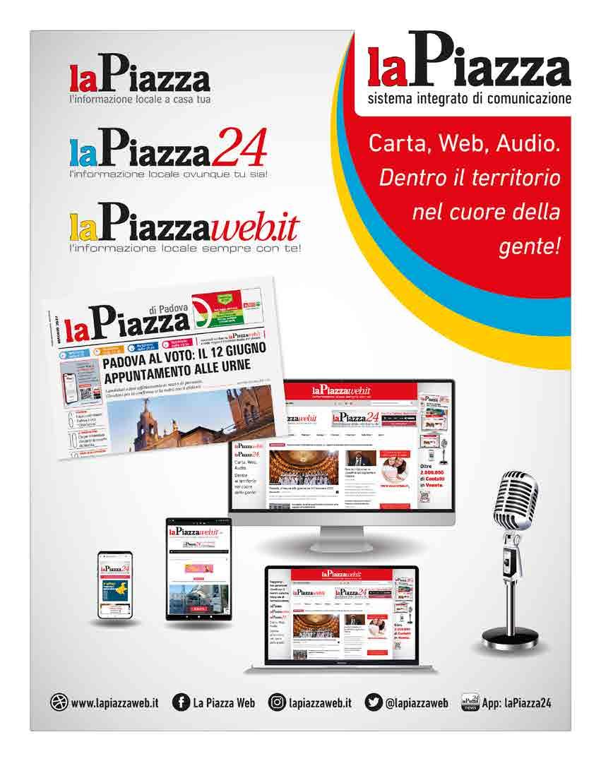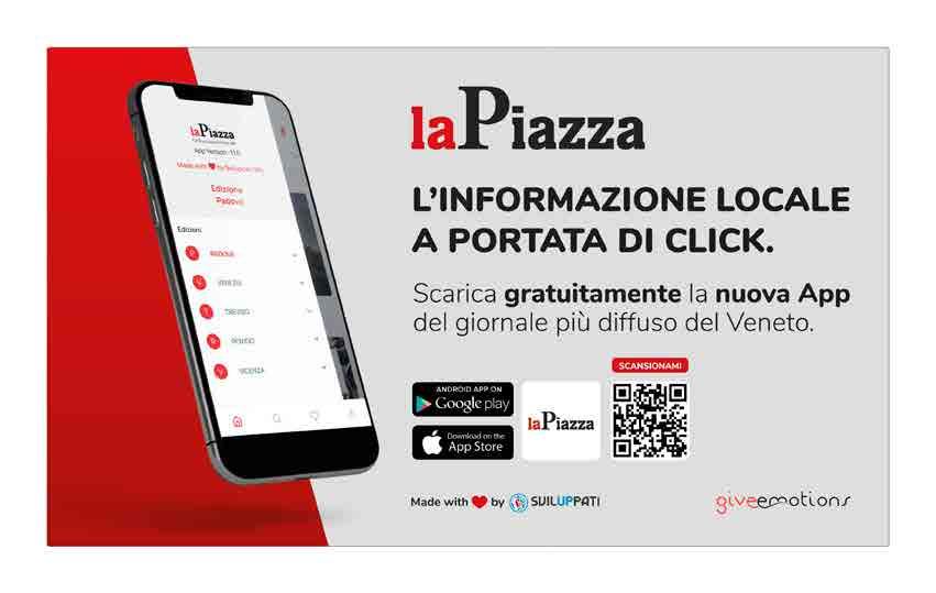 È un periodico formato da 23 edizioni locali mensilmente recapitato a 506.187 famiglie del Veneto. Direzione, Amministrazione e Concessionaria di Pubblicità Locale: via Lisbona, 10 · 35127 Padova tel. 049 8704884 · fax 049 6988054 >redazione@givemotions.it< >www.lapiazzaweb.it< Redazione: Direttore responsabile Nicola Stievano >direttore@givemotions.it< Redazione >redazione@givemotions.it< è una testata giornalistica di proprietà di Srl Periodico fondato nel 1994 da Giuseppe Bergantin Centro Stampa: Rotopress International via Brecce · Loreto (An) Chiuso in redazione il 12 dicembre 2022