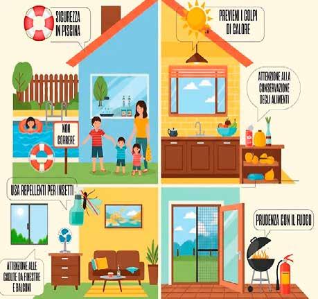 in uso e mantenerli lontani dai bambini. Anche l’elettricità può diventare pericolosa con l’uso intenso di ventilatori, climatizzatori e dispositivi portatili; è bene evitare prese multiple e non utilizzare apparecchi elettrici con mani bagnate o vicino a piscine.