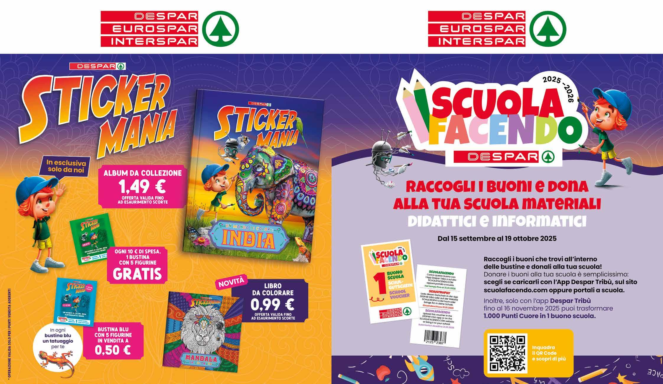 Dopo il successo dello scorso anno, con oltre 11.400 premi donati a più di 2.300 scuole, Despar Nord rinnova il suo impegno con Scuolafacendo 2025/2026, il progetto nazionale a sostegno dell’istruzione. Dal 15 settembre al 19 ottobre 2025, nei punti vendita Despar, Eurospar e Interspar, ogni 10 euro di spesa i clienti riceveranno una bustina di figurine Stickermania contenente un “Buono Scuola” che potranno destinare a un istituto scolastico del proprio territorio. I buoni potranno essere consegnati direttamente alle scuole o caricati sul sito del progetto www.scuolafacendo.com e sull’app dedicata. In più, tramite l’App Despar Tribù sarà possibile convertire i propri Punti Cuore in ulteriori buoni fino al 16 novembre.